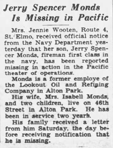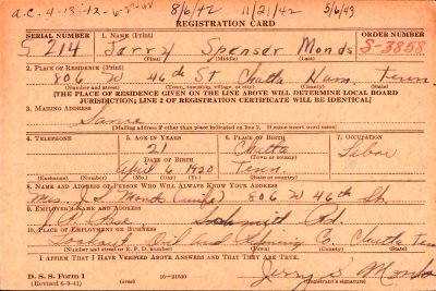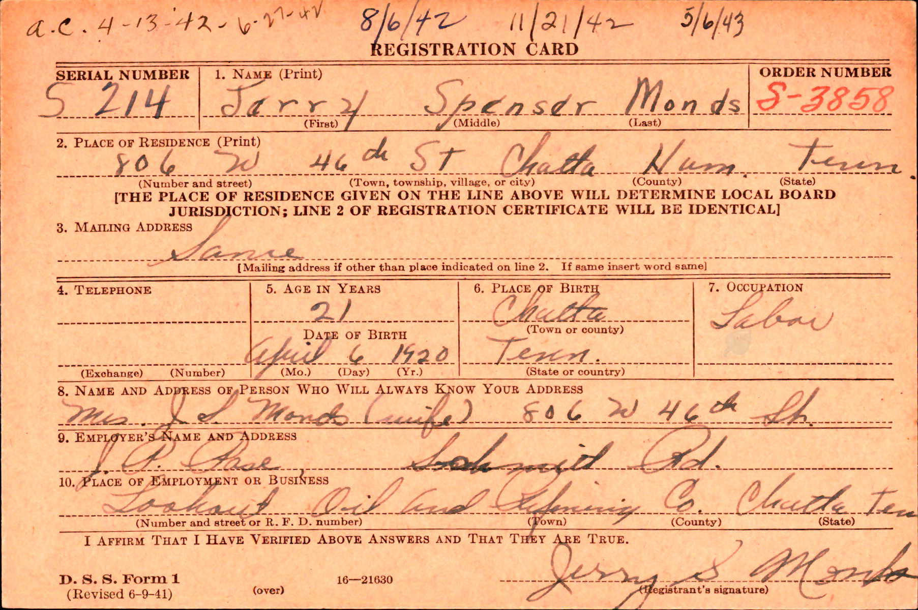 Jerry Spencer Monds was born in Chattanooga, Tennessee to Jerry Spencer Monds Sr. and Jennie Belle Ritchey. Husband of Isabell Shadrick. Father of Nancy and Kenneth Monds. He was an employe of the Lookout Oil & Refining Company before entering the service. He had been overseas since 1944. He was a former student in Chattanooga schools.