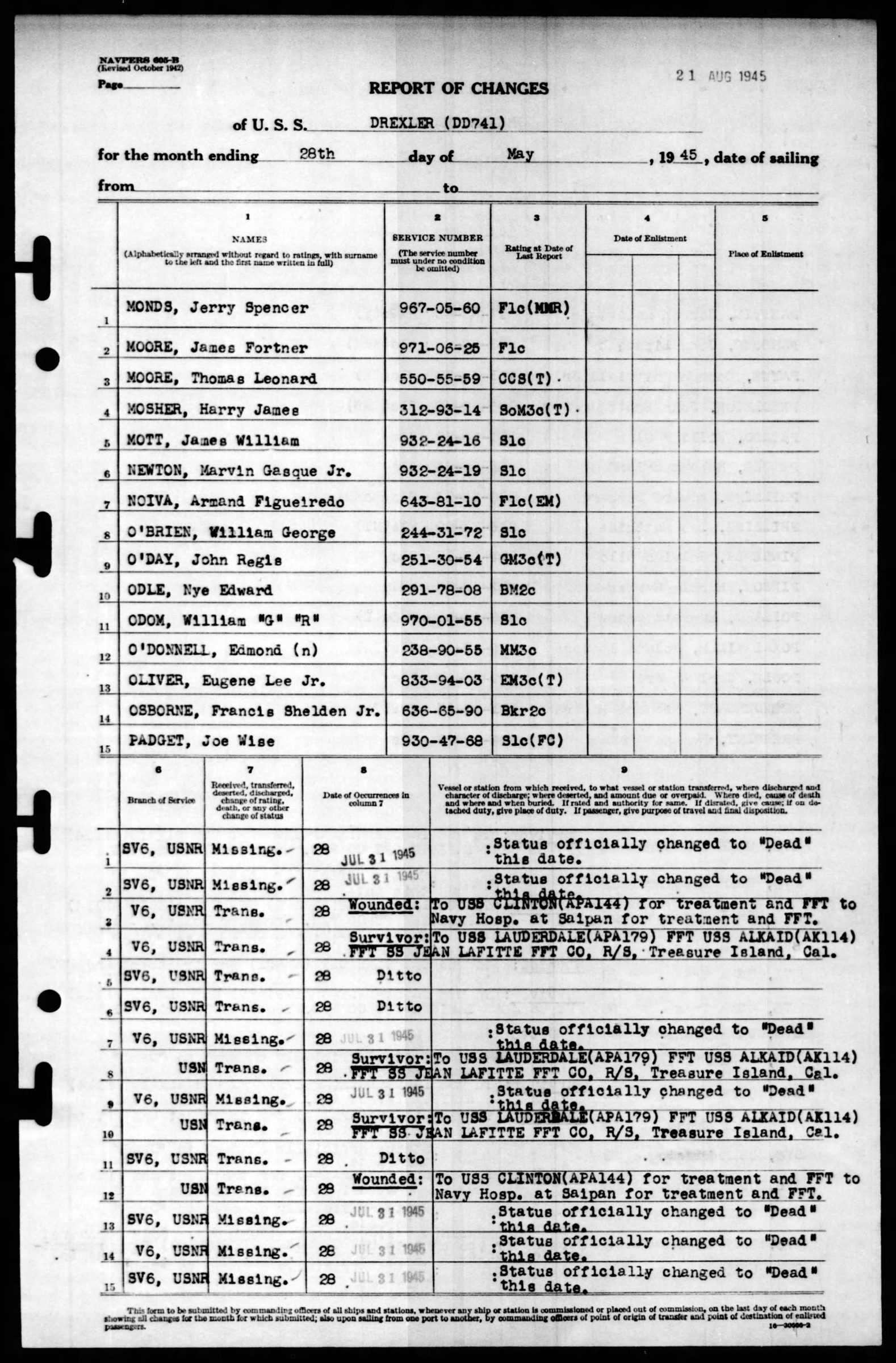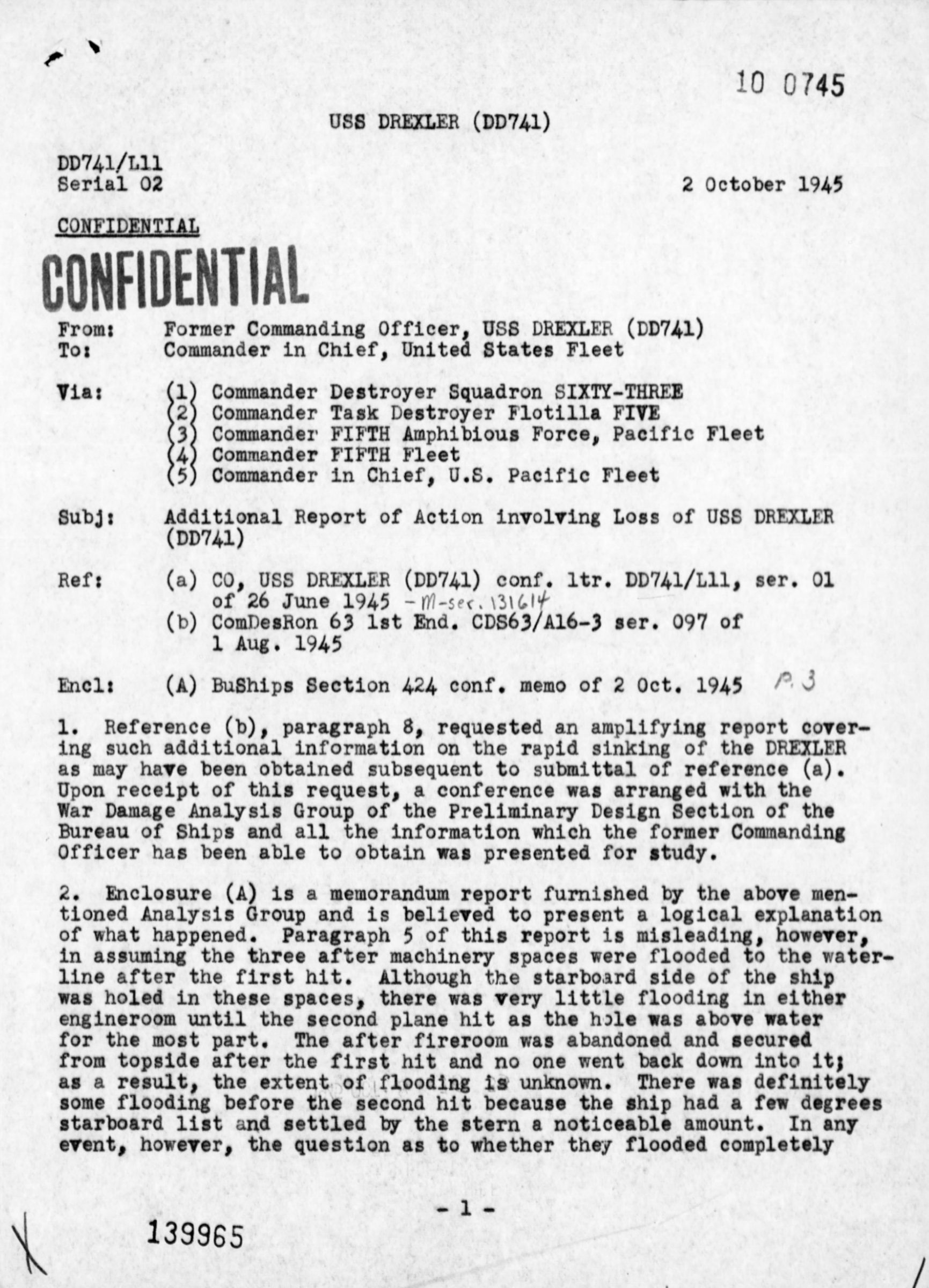 The Drexler was sunk off Okinawa by three Japanese suicide planes. The ship went down in less than two minutes after the third hit, killing 138 crew members and wounding 52 others.