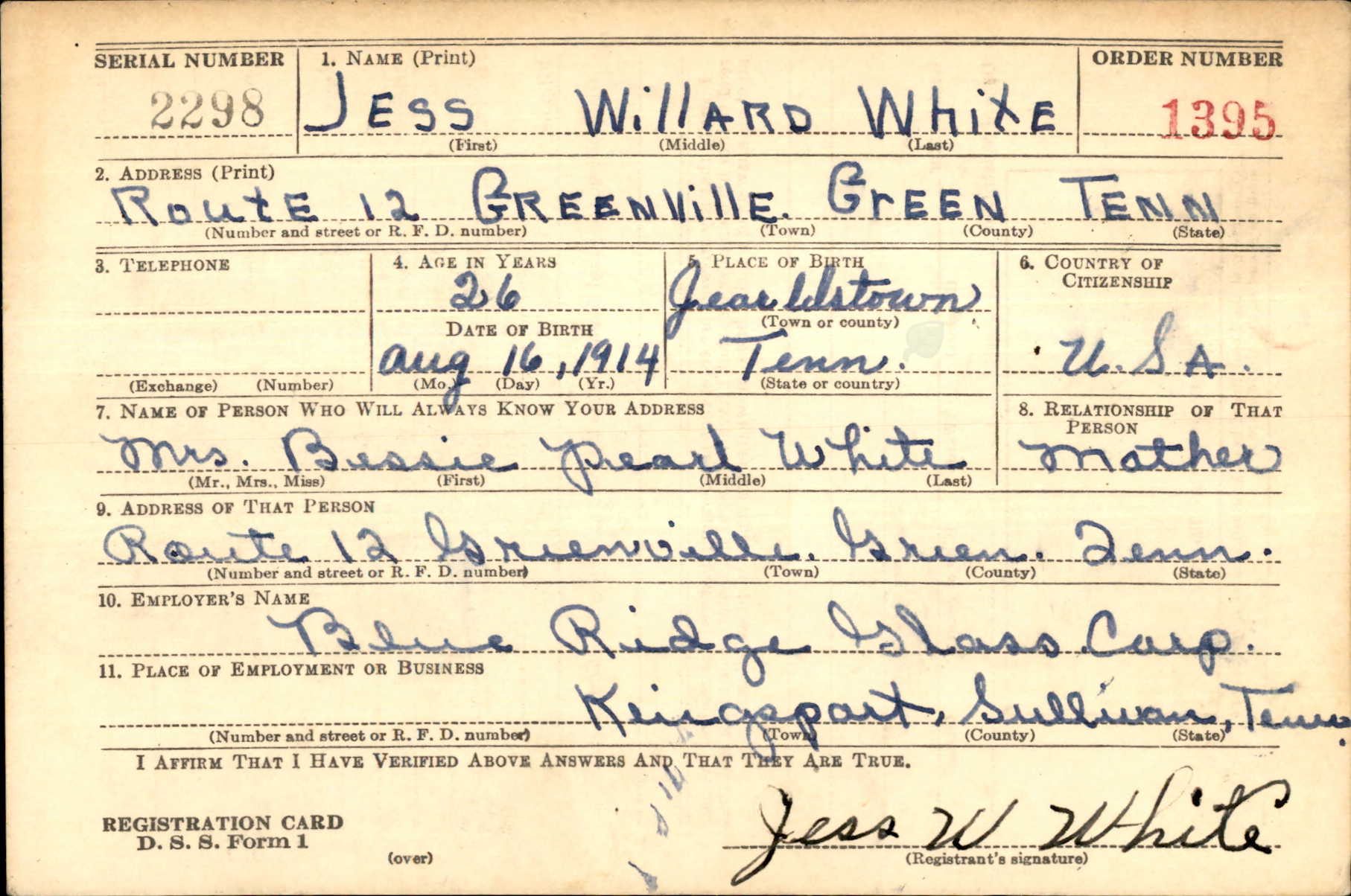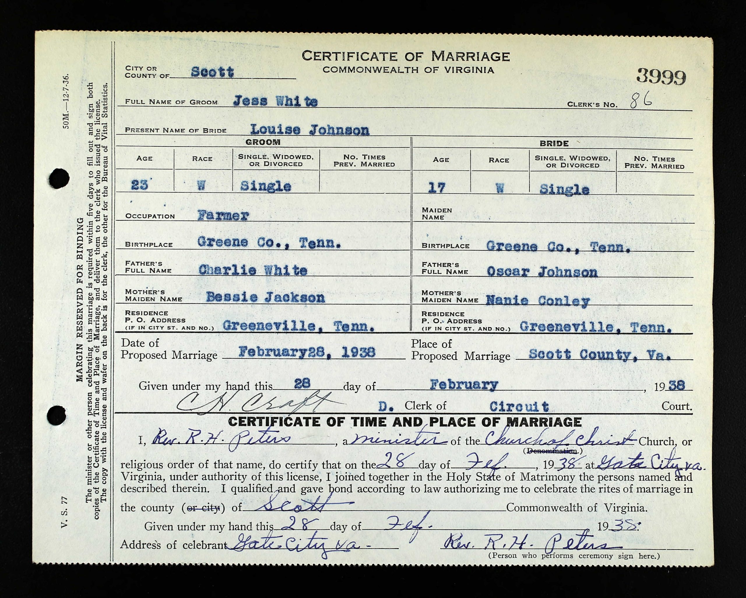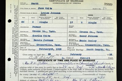 Jess Willard White was born at Jearoldstown, Tennessee, the son of Charlie Anderson White and Bessie Pearl Jackson of Greeneville, TN. He married Louise Johnson in Virginia in 1938.