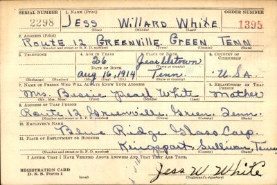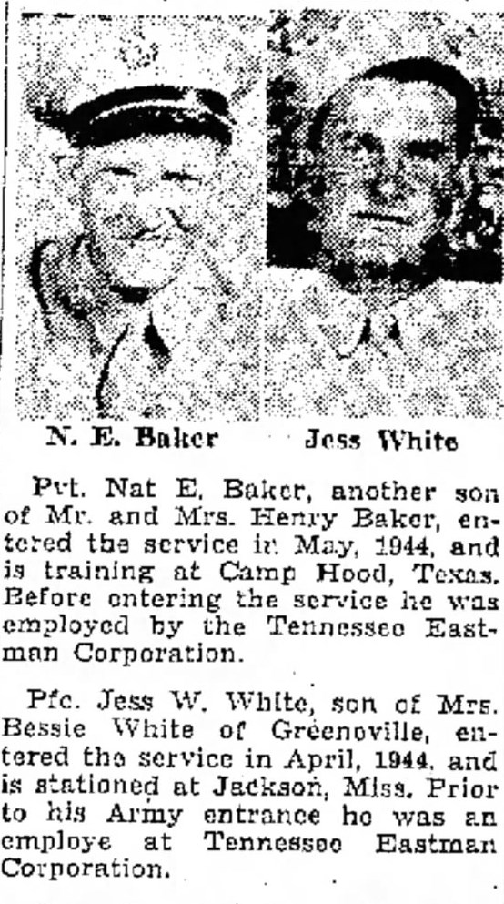 Jess White enlisted on 11 April 1944 at Camp Shelby in Mississippi and was stationed at Jackson, Miss. Prior to his Army entrance he was an employee at Tennessee Eastman Corporation. He is buried at Bethany Free Will Baptist Church Cemetery, Jearoldstown, Greene County, Tennessee.
