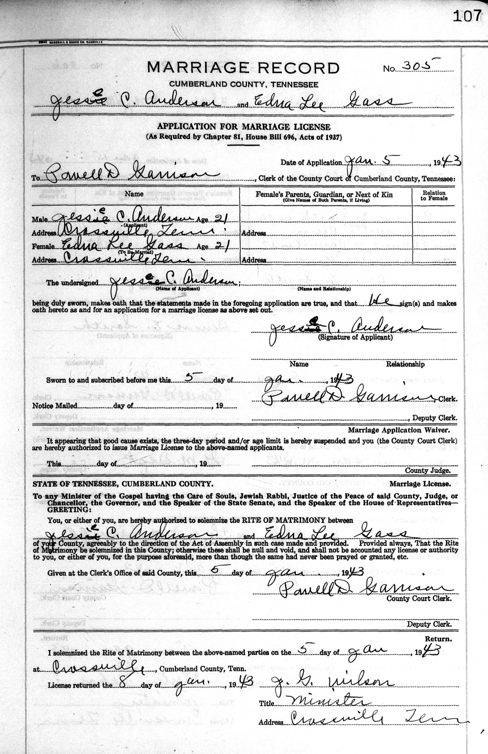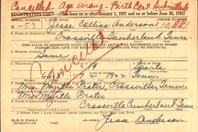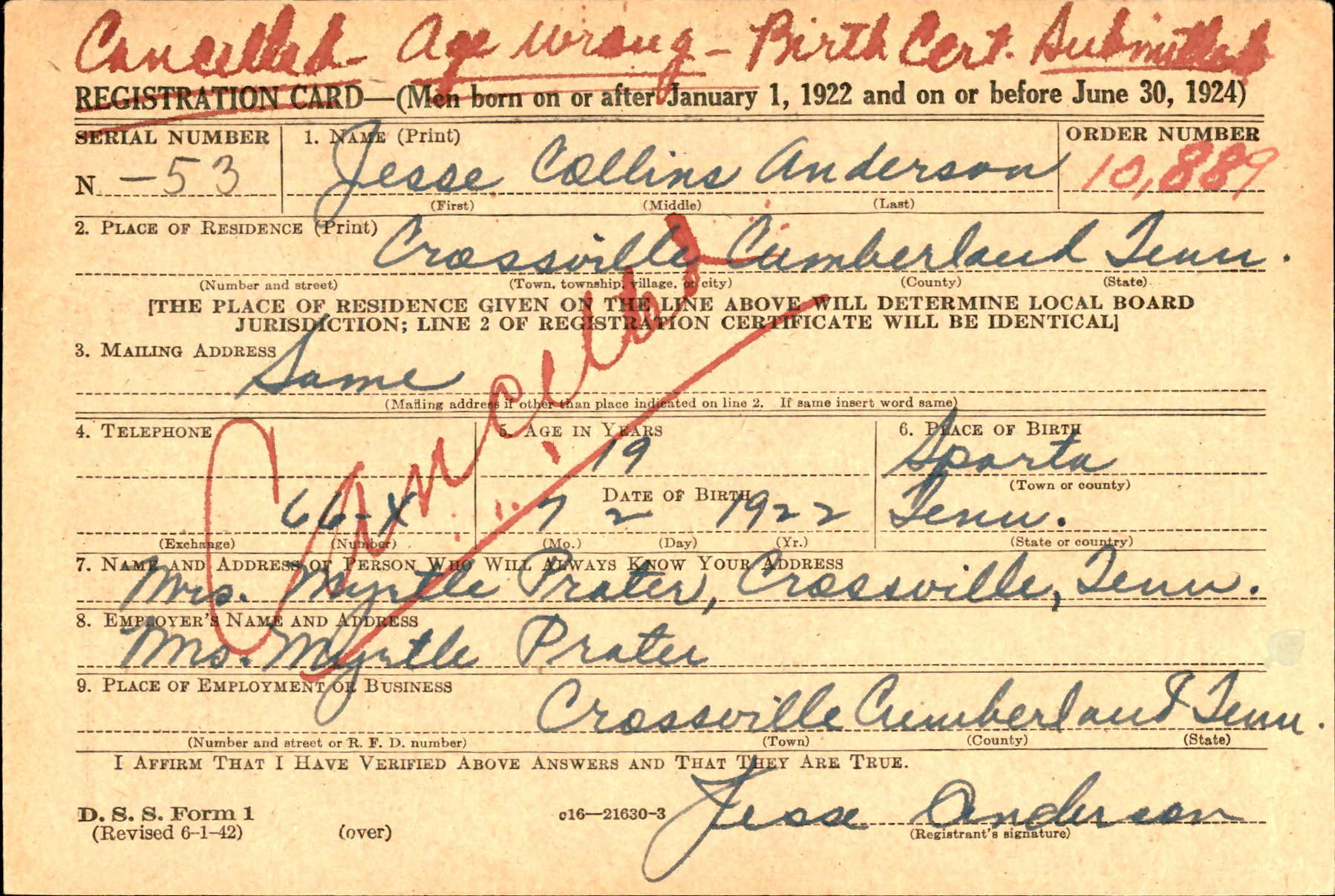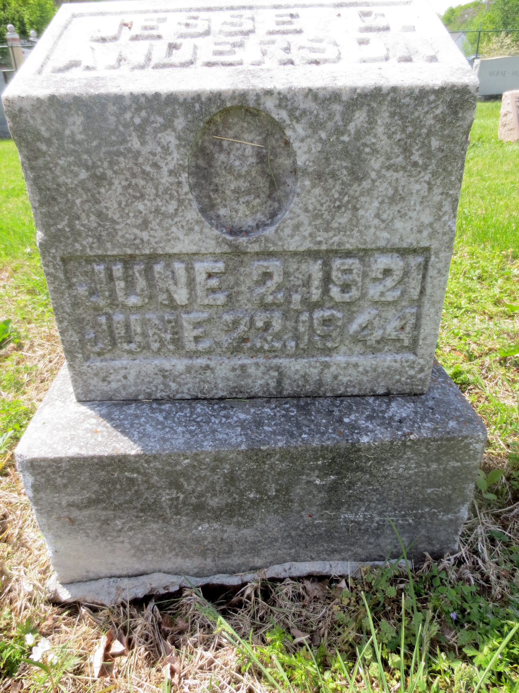 Jesse Collins Anderson was born on 2 June 1921 in Sparta, Tennesse, son of Sam A. Anderson and Mary Margaret Pirtle, Jesse C. Anderson married Edna Lee Gass 5 January 1943 in Crossville, TN, his hometown. He enlisted on 6 April 1943 at Fort Oglethorpe, Georgia. He was Killed in Action in Italy on 22 June 1944.