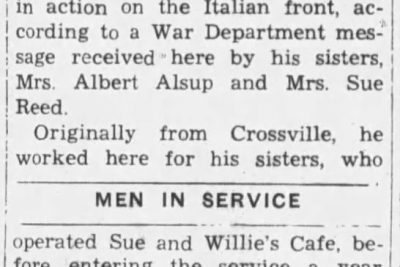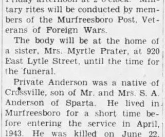 Private Anderson was a native of Crossville, son of Mr. and Mrs. S.A. Anderson of Sparta. He lived in Murfreesboro for a short time before entering the service in April, 1943. He was killed on June 22, 1944. He served with the 36th Infantry Division. He was 21 years old. He was a member of the Methodist Church. Surviving in addition to his parents and his sister, Mrs. Prater, are his wife, Mrs. Edna Lee Anderson of Lima, Ohio; three other sisters, Mrs. Willie Alsup, Mrs. Sue Reed and Miss Bonnie Anderson, of Murfreesboro; and three brothers, T.J. and Virble Anderson of Murfreesboro, and Joe Anderson of Cookeville.