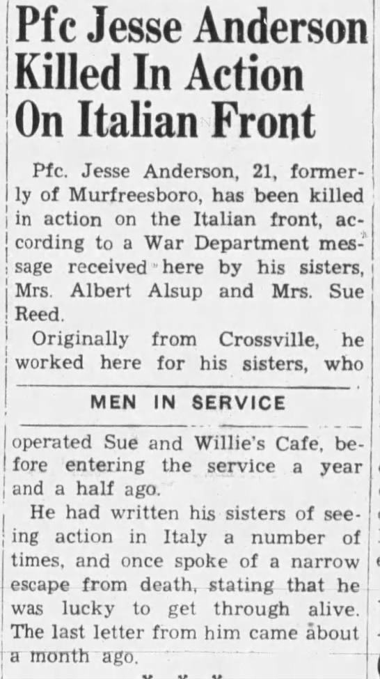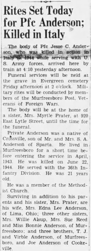 The body of Pfc Jesse C. Anderson, who was killed in action in Italy in 1944 while serving with U.S. Army Forces, arrived here by train at 4:10 yesterday afternoon. Funeral services will be held at the grave in Evergreen cemetery. Military rites will be conducted by member of the Murfreesboro Post, Veterans of Foreign Wars. The body will be at the home of a sister, Mrs. Myrtle Prater, at 920 East Lytle Street, until the time for the funeral.