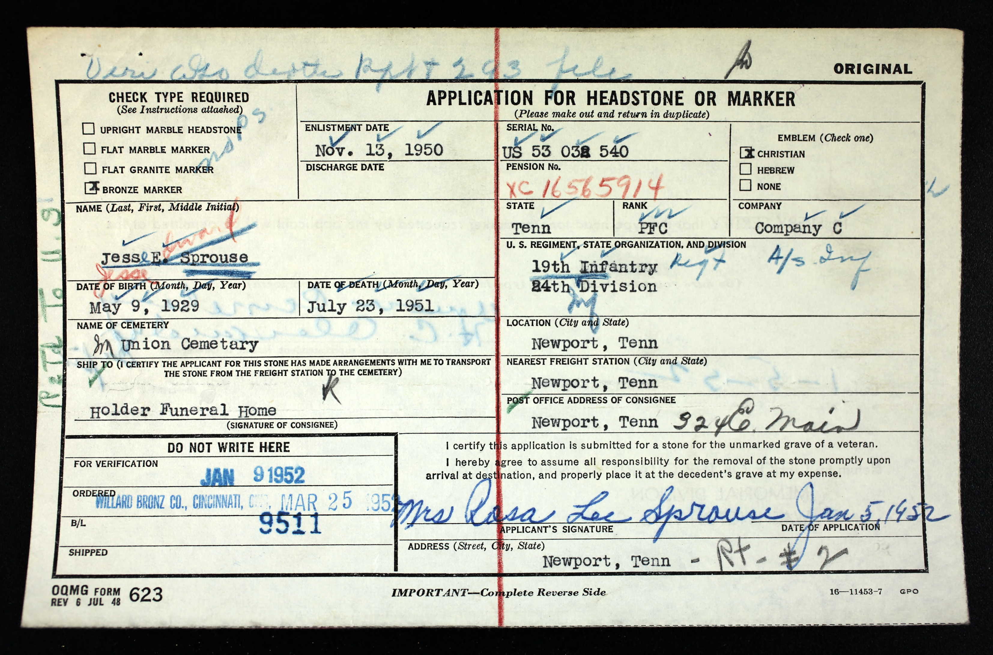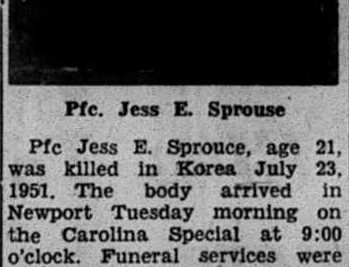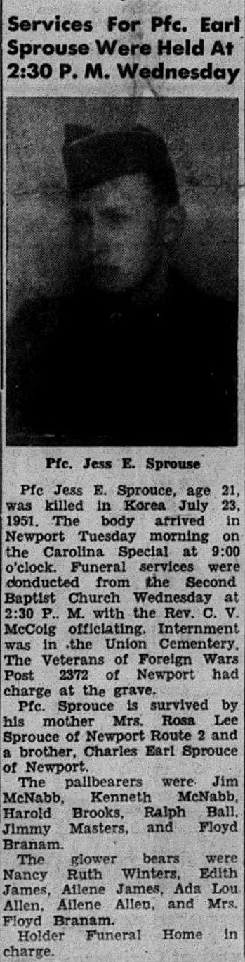 Pfc. Jess E. Sprouse, age 21, was killed in Korea July 23, 1951. The body arrived in Newport on the Carolina Special. Funeral services were conducted from the Second Baptist Church. Internment was in the Union Cemetery.