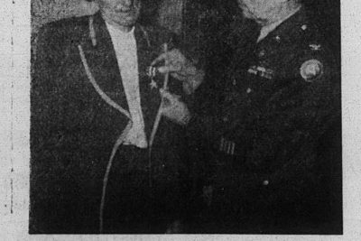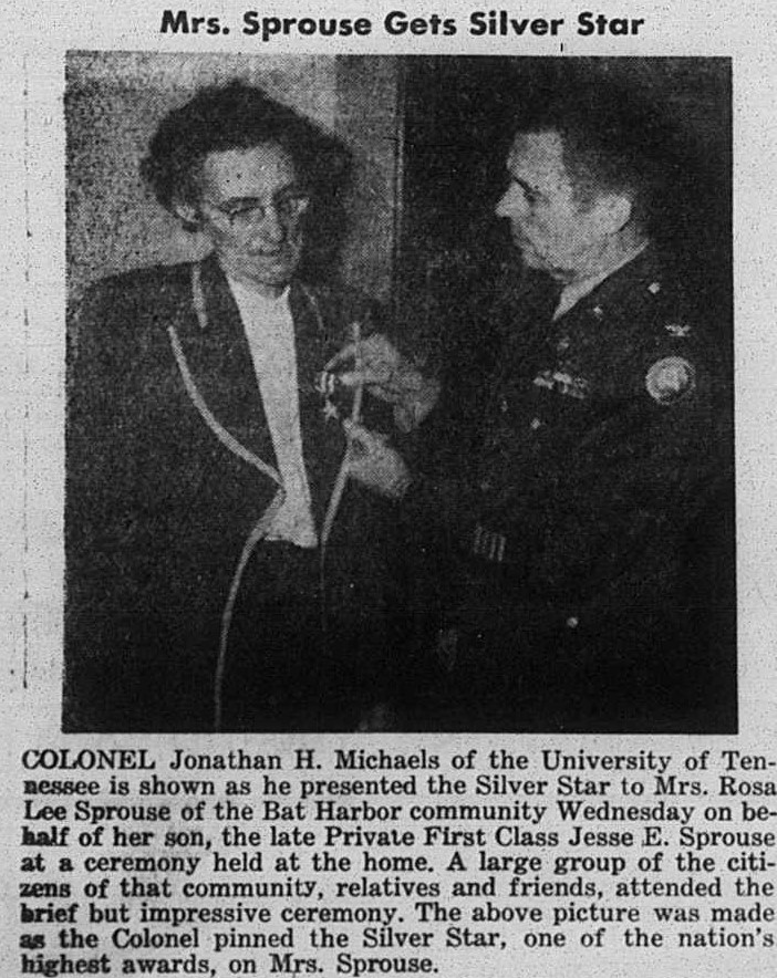 Colonel Jonathan H. Michaels of the University of Tennessee is shown as he presented the Silver Star to Mrs. Rosa Lee Sprouse of the Bat Harbor community Wednesday on behalf of her son, the late Private First Class Jesse E. Sprouse at a ceremony held at the home. A large Group of the citizens of that community, relatives and friends, attended the brief but impressive ceremony. The picture was made as the Colonel pinned the Silver Star, one of the nation’s highest awards, on Mrs. Sprouse.