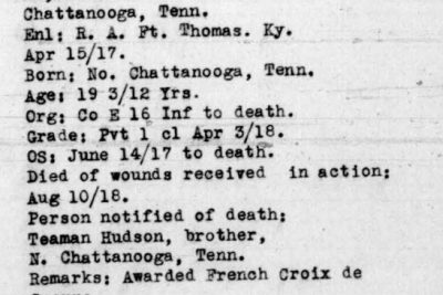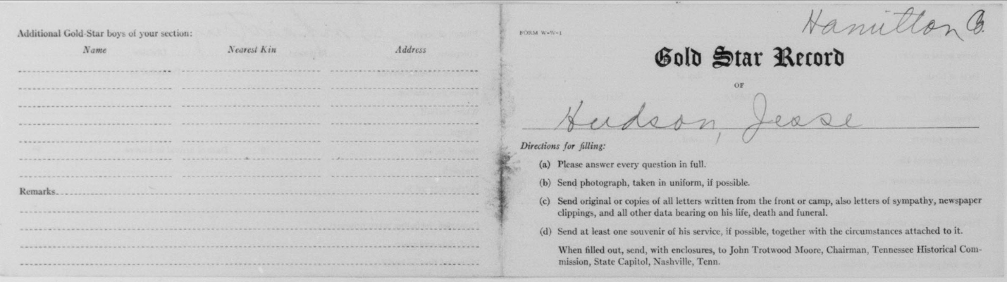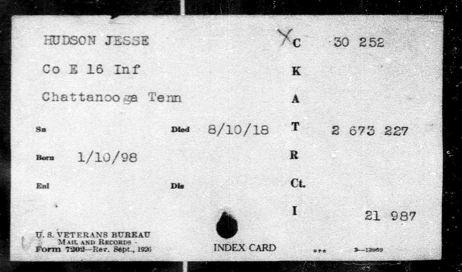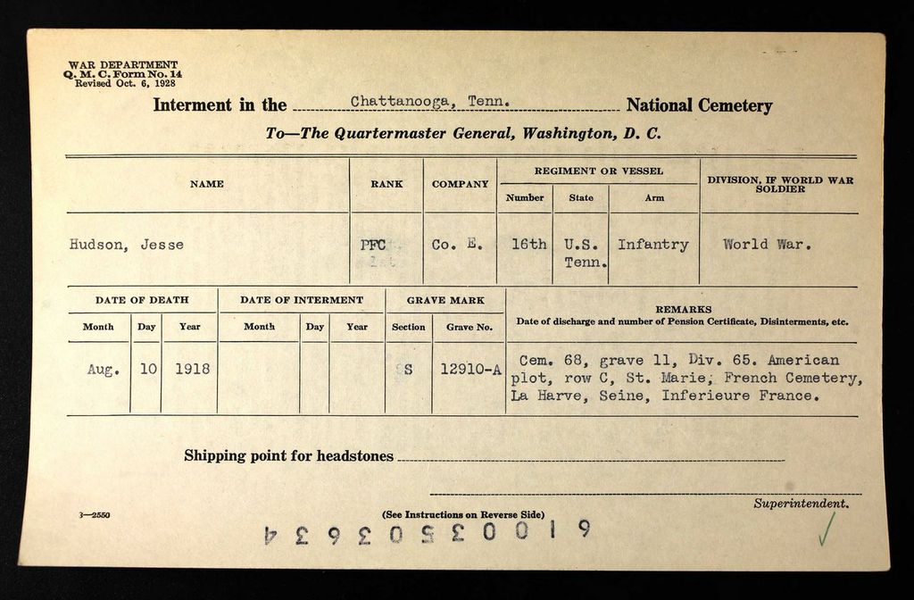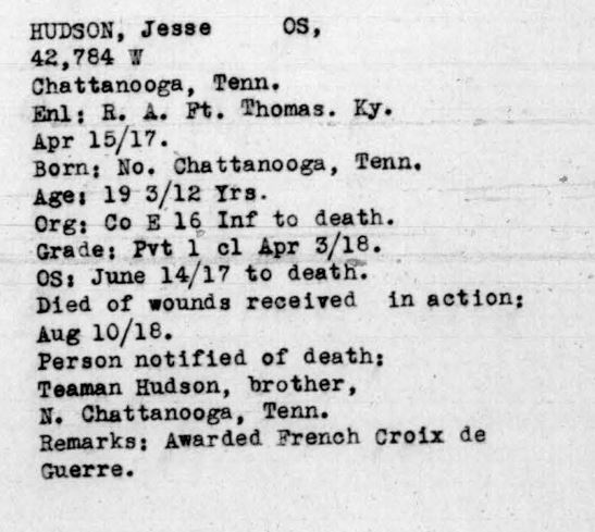 Jesse Hudson was born in Chattanooga, Tennessee. He died at the age of 19 of wounds received in action 10 August 1918