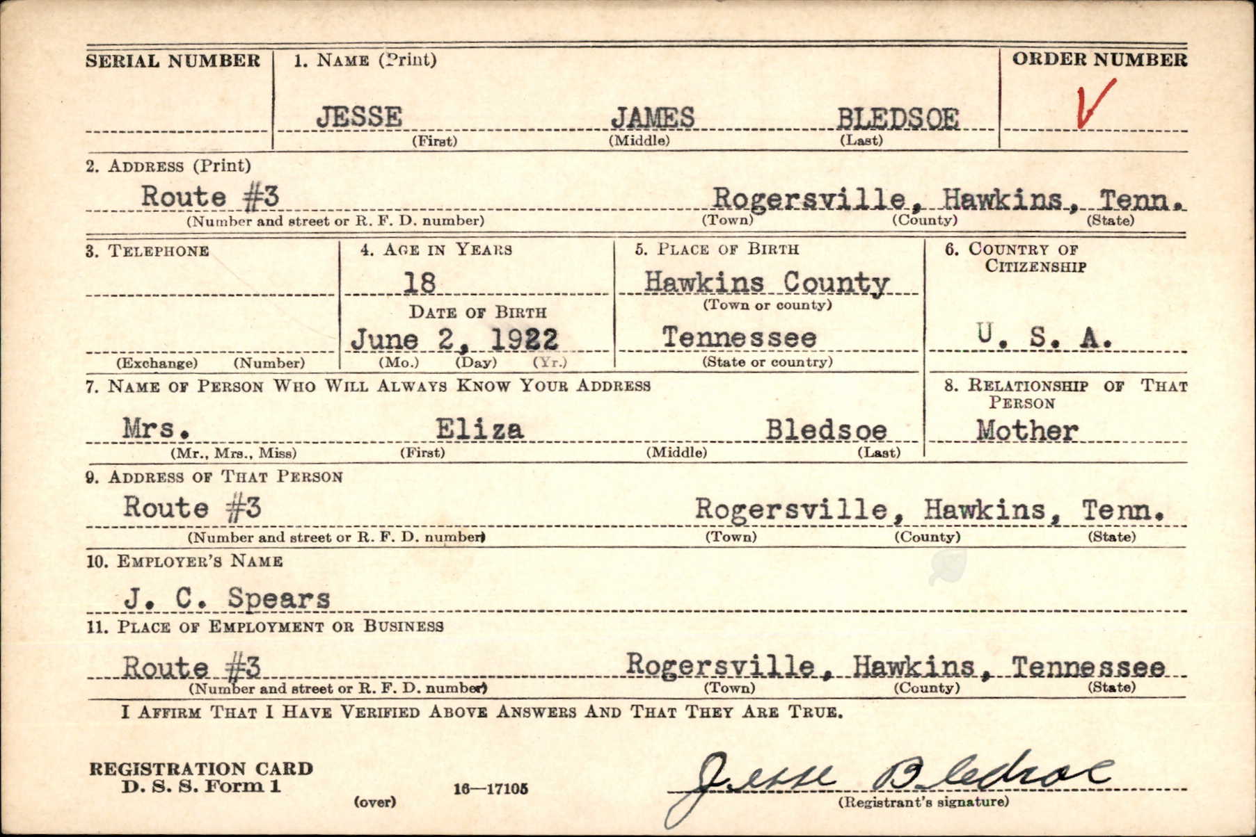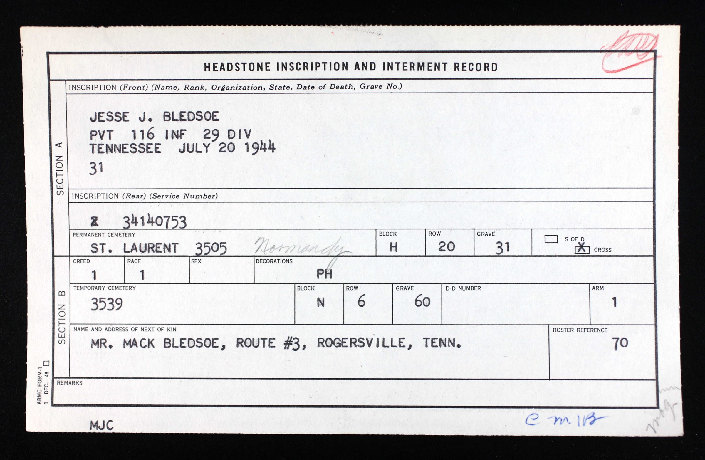 Private Jesse J. Bledsoe was assigned to the 116th Infantry Regiment, 29th Infantry Division. At the time of his death the 29th was involved in the assault on Saint-Lo, France during the Normandy Campaign. He died of wounds on 20 July 1944 and is interred at H,20,31 Normandy American Cemetery, Colleville-sur-Mer, France.