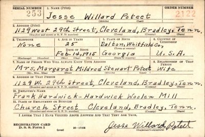 Jesse Willard Poteet was born on February 14, 1915 in Whitfield County, Georgia. Son of Thomas Napoleon and Mattie Poteet. was onboard the British troopship HMT (Her Majesties Transport) Rohna in the Mediterranean Sea. On November 26, 1943, during WWII, one thousand, one hundred and thirty eight men perished when the Rohna was attacked from the air by a German missile and destroyed in the Mediterranean Sea off the coast of Algeria.