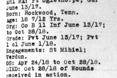 Jessie or Jesse Branan was born in Rockwood, Tennessee. He is listed under Monroe County in State records. His father lived in Catoosa, Tennessee. He served with Company B, 117th Infantry. He departed at Hoboken, New Jersey on 24 April 1918. He died of wounds, previously reported missing in action.
