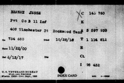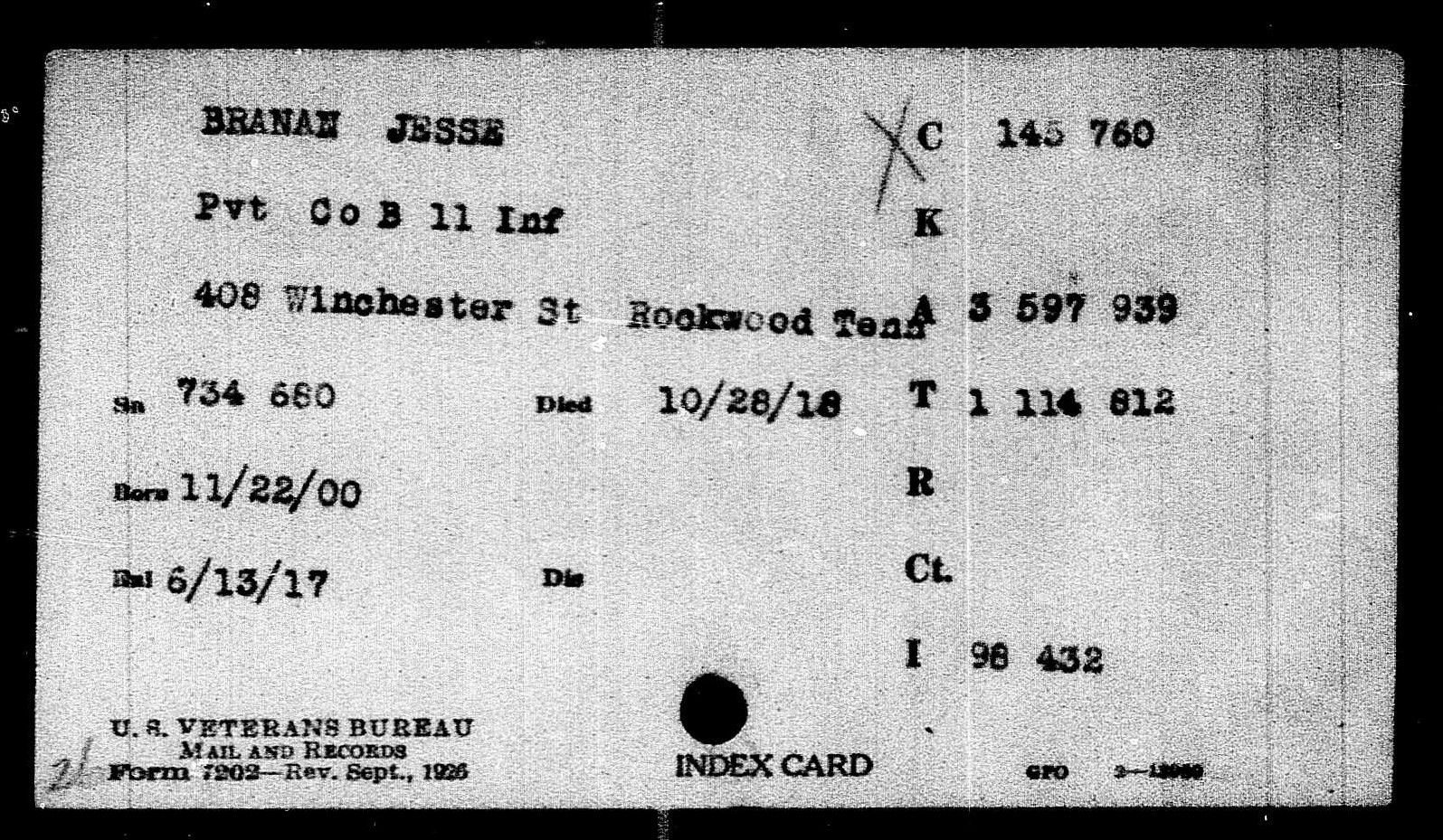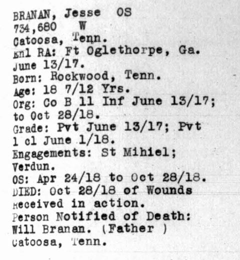 “Funeral of Jesse BRANAN. Another Rockwood Hero Laid to Rest. The impressive funeral service for Jesse BRANAN, 19, son of Mr. and Mrs. William BRANAN was conducted here Sunday under the auspices of the local post American Legion. The Rev. Leland COOK, conducted the services. The body was interred in the Emory Gap cemetery. Young BRANAN was reported missing in action Oct. 24, 1918. His death occurred four days later, the result of wounds. The mother died about seven years ago. The father now resides in Rockwood. He is also survived by two brothers and two sisters.” The Rockwood Times, Thursday, 20 Oct 1921, Vol. 41, No. 37.