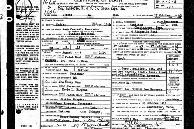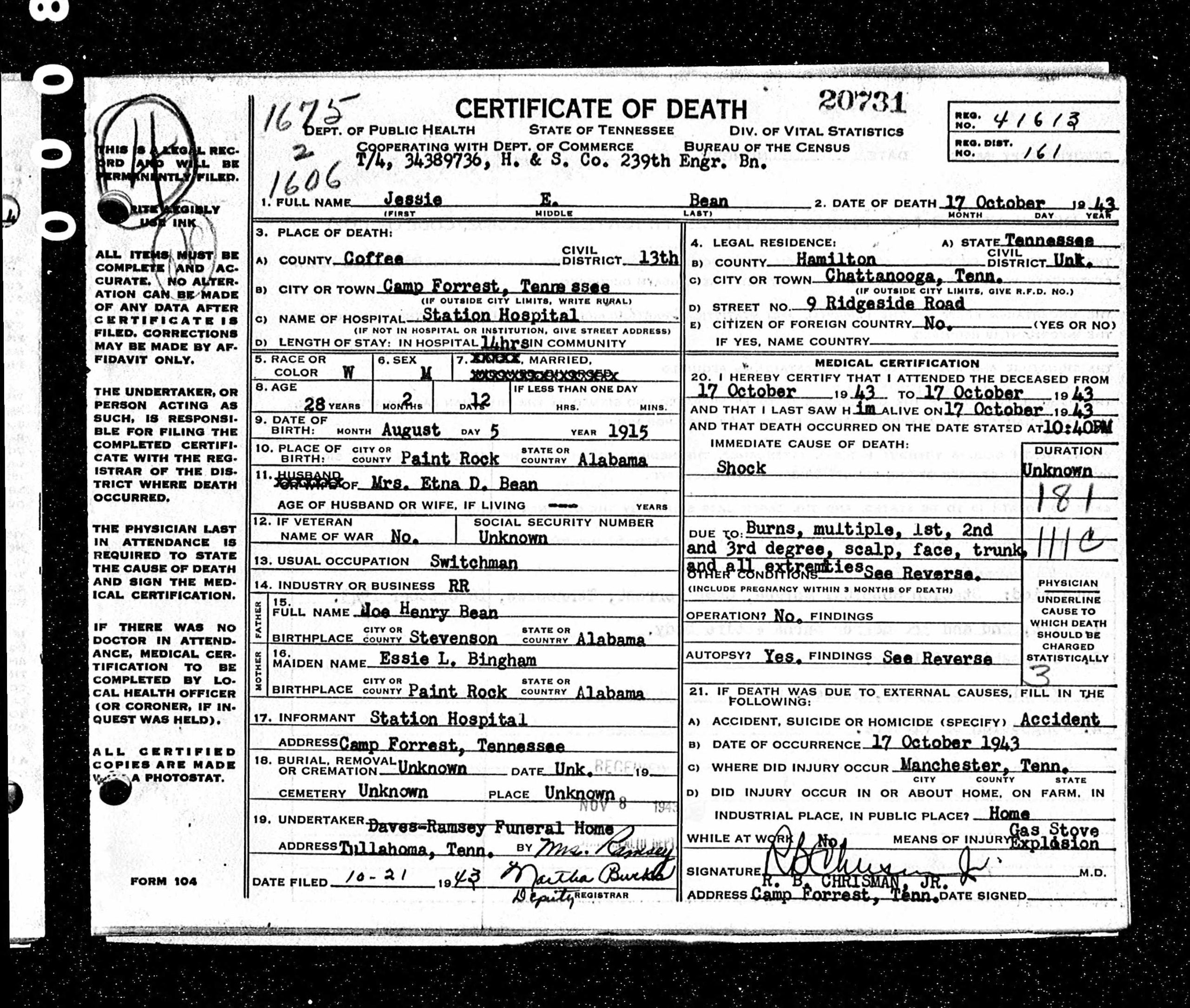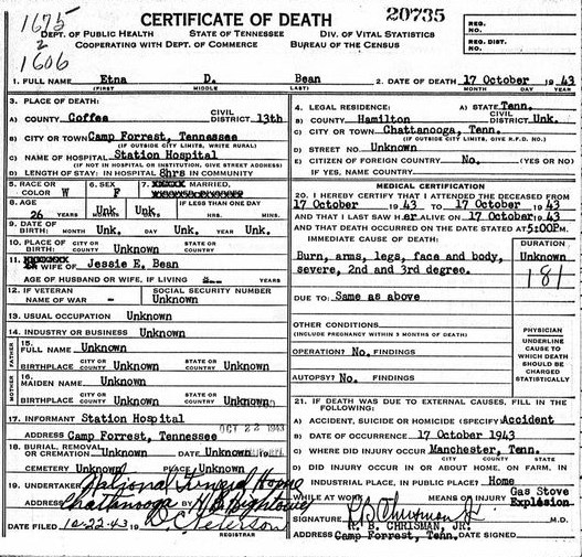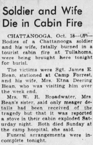 Chattanooga – Bodies of a Chattanooga soldier and his wife, fatally burned in a tourist cabin fire at Tullahoma, were being brought here Monday night for burial. The victims were Sgt James E. Bean, stationed at Camp Forrest, and his wife, Mrs. Etna Deering Bean, who was visiting him over the weekend.