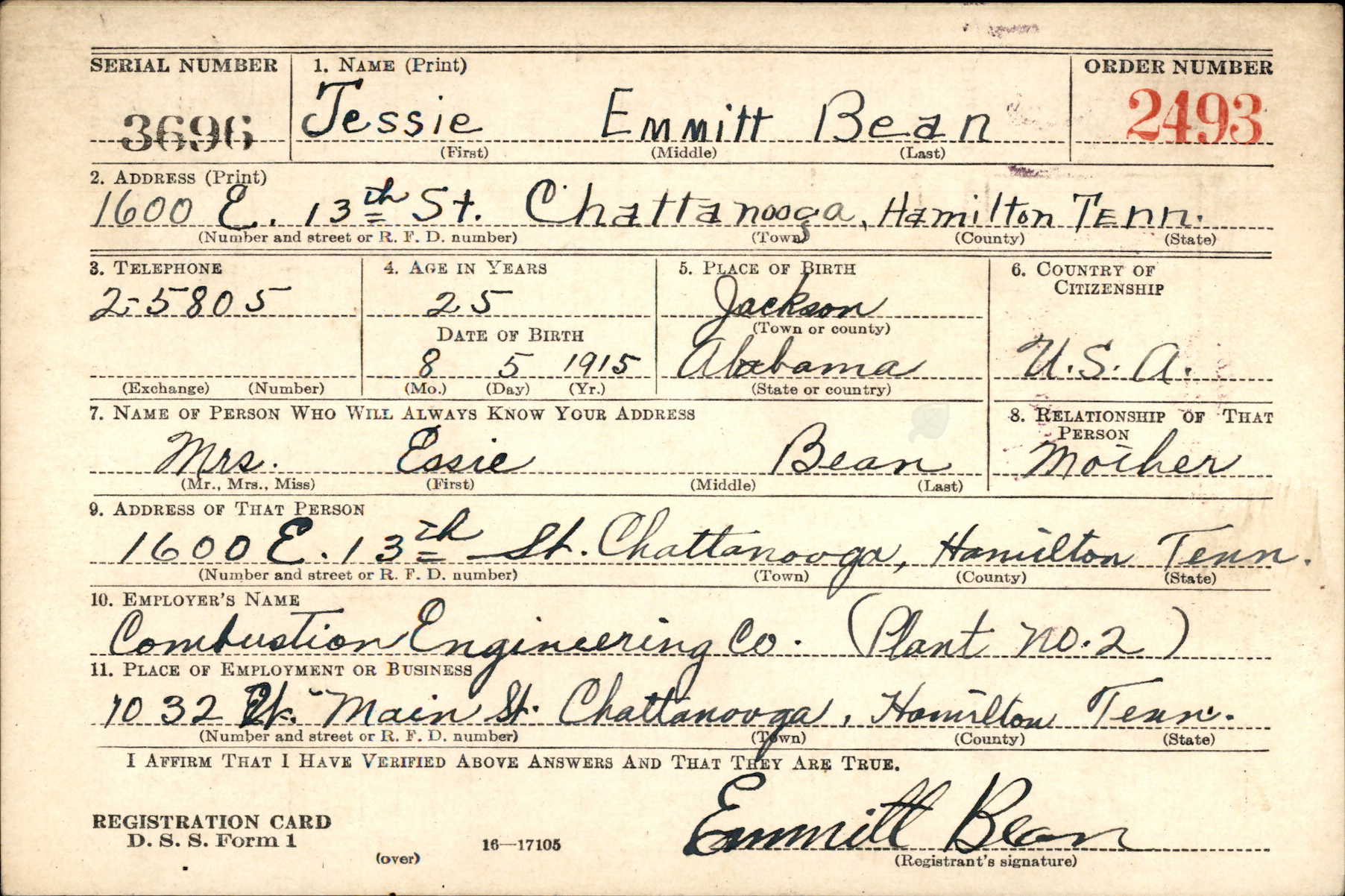 Jessie Emmitt Bean was born in Alabama, the son of Joseph “Joe” Henry Bean and Essie Bingham. He married Etna Belle Deering in april 1942.