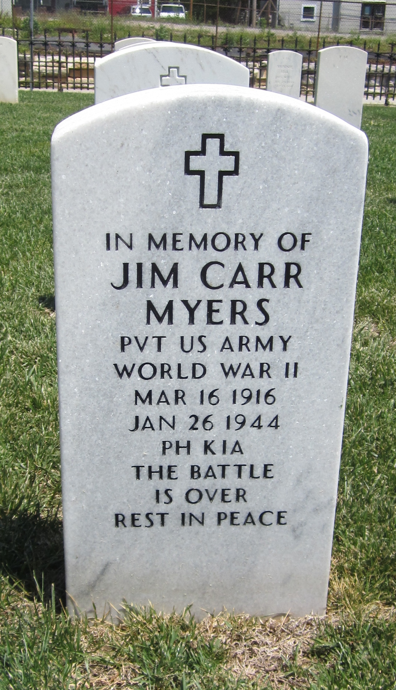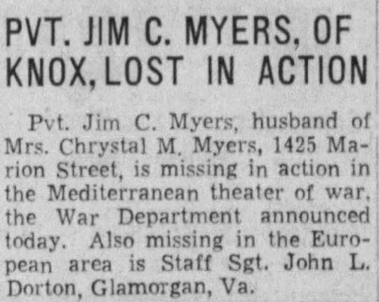 Pvt. Jim Carr Myers was born on March 16, 1918 in New Tazewell, Claiborne County, TN, to Silas Myers and Emily Shelton. Husband of Chrystal Mae Spears and father of Delores Myers.