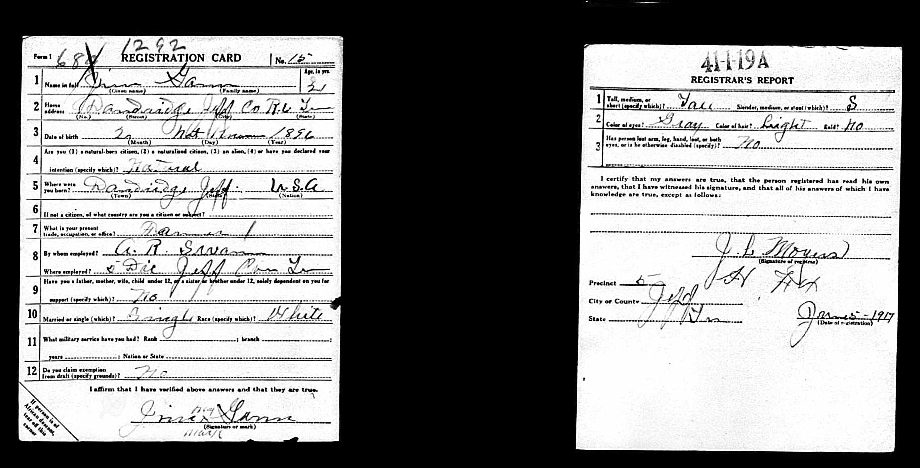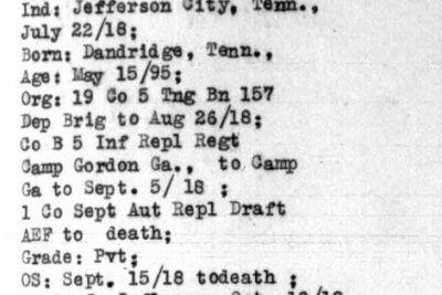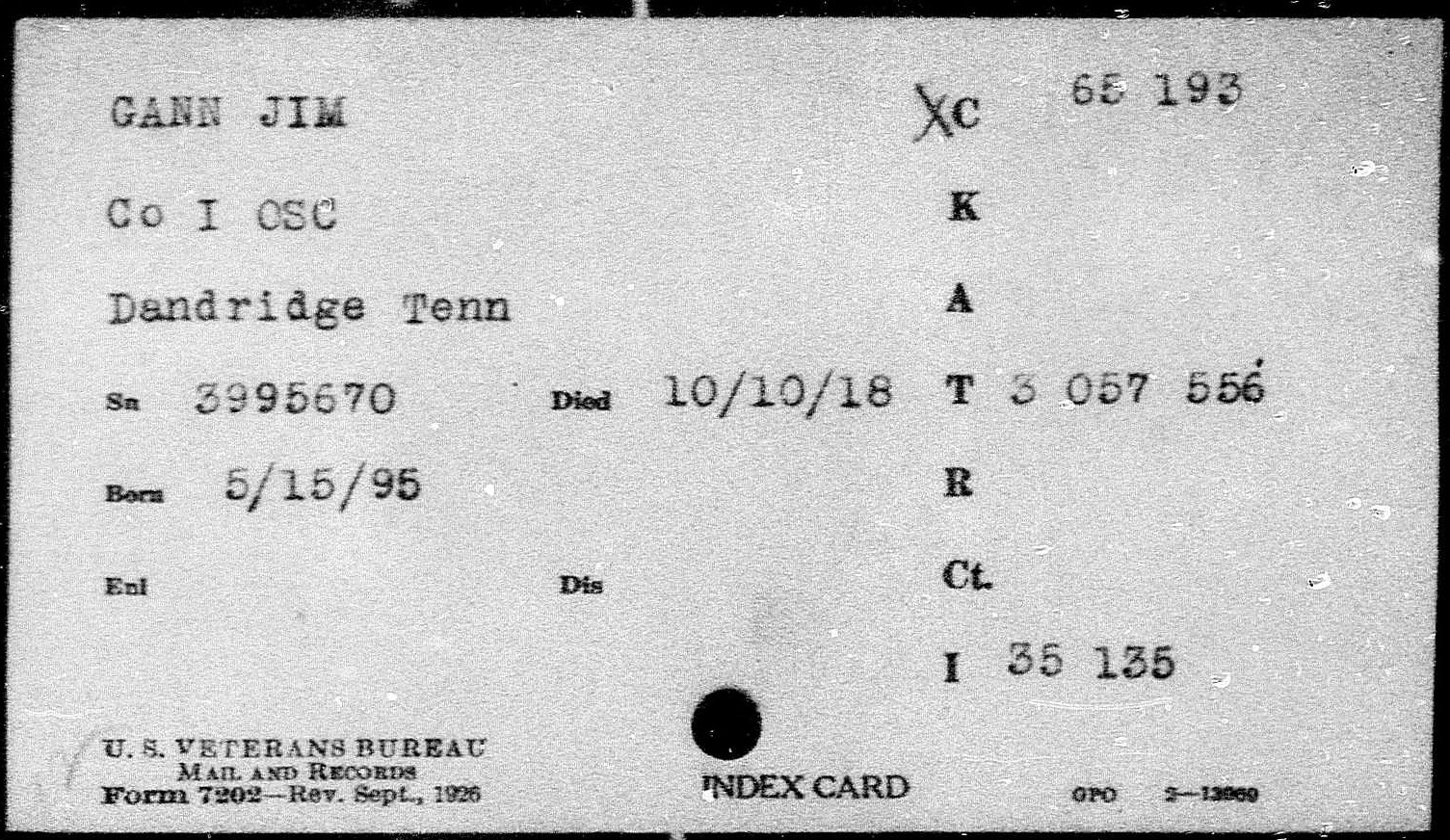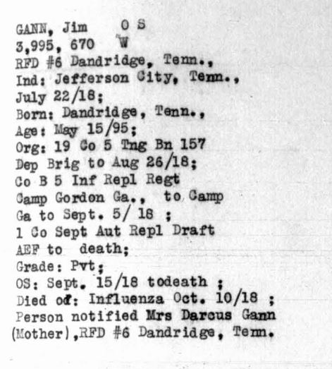 Jim Gann was born in 1895 in Dandridge, Tennessee. He died of influenza on 10 October 1918