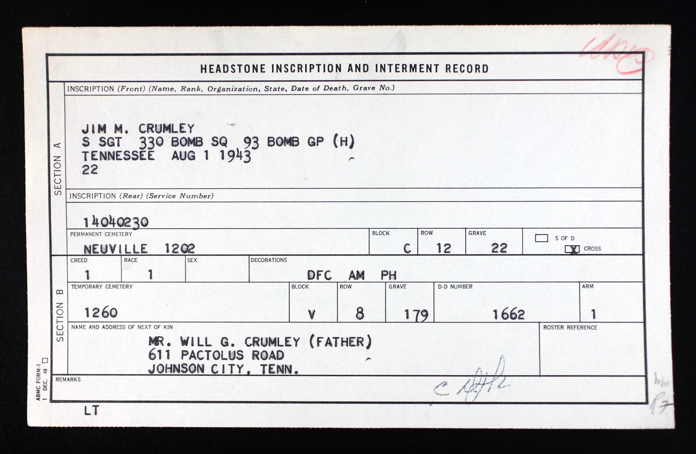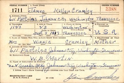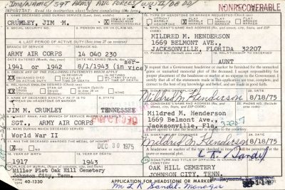 Staff Sergeant James Miller “Jim” Crumley, US Army Air Forces, was assigned to the 330th Bomber Squadron, 93rd Bomber Group Heavy, The Traveling Circus, flying a B-24. He was the son of William G. and Jewell L. Miller Crumley. He was born in September 1917, in Johnson City, Tennessee.