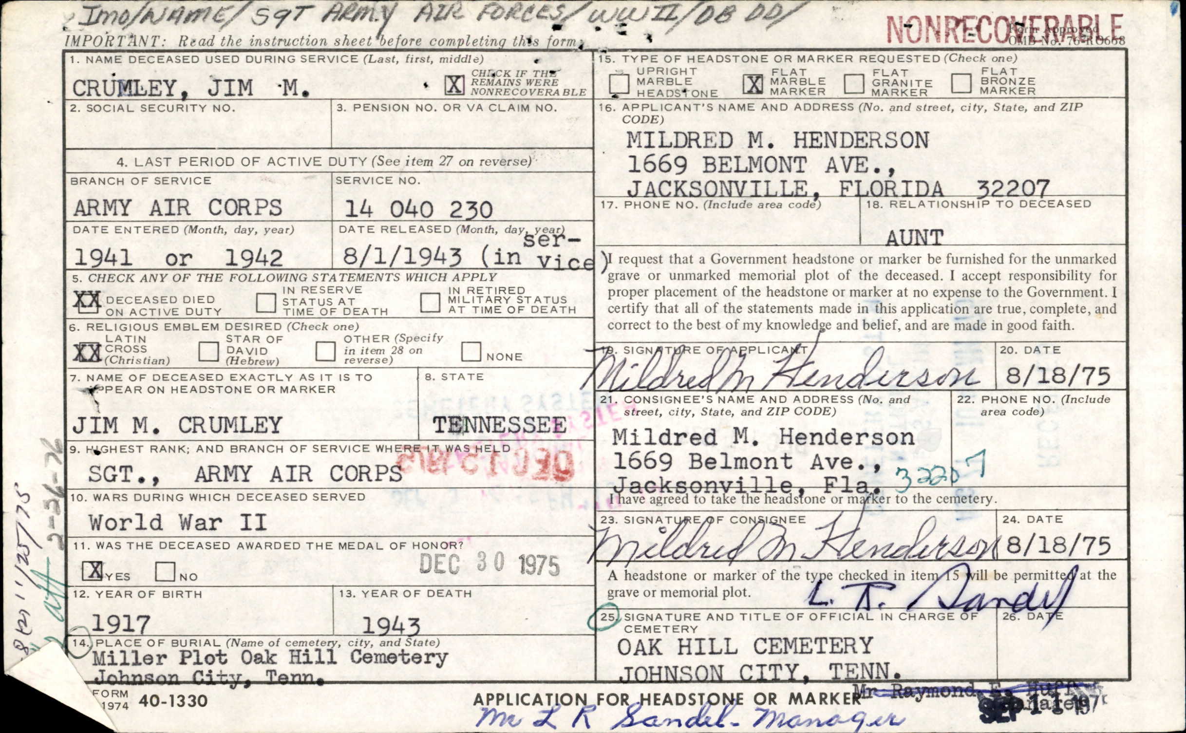 - Service Branch: Army/Army Air Forces