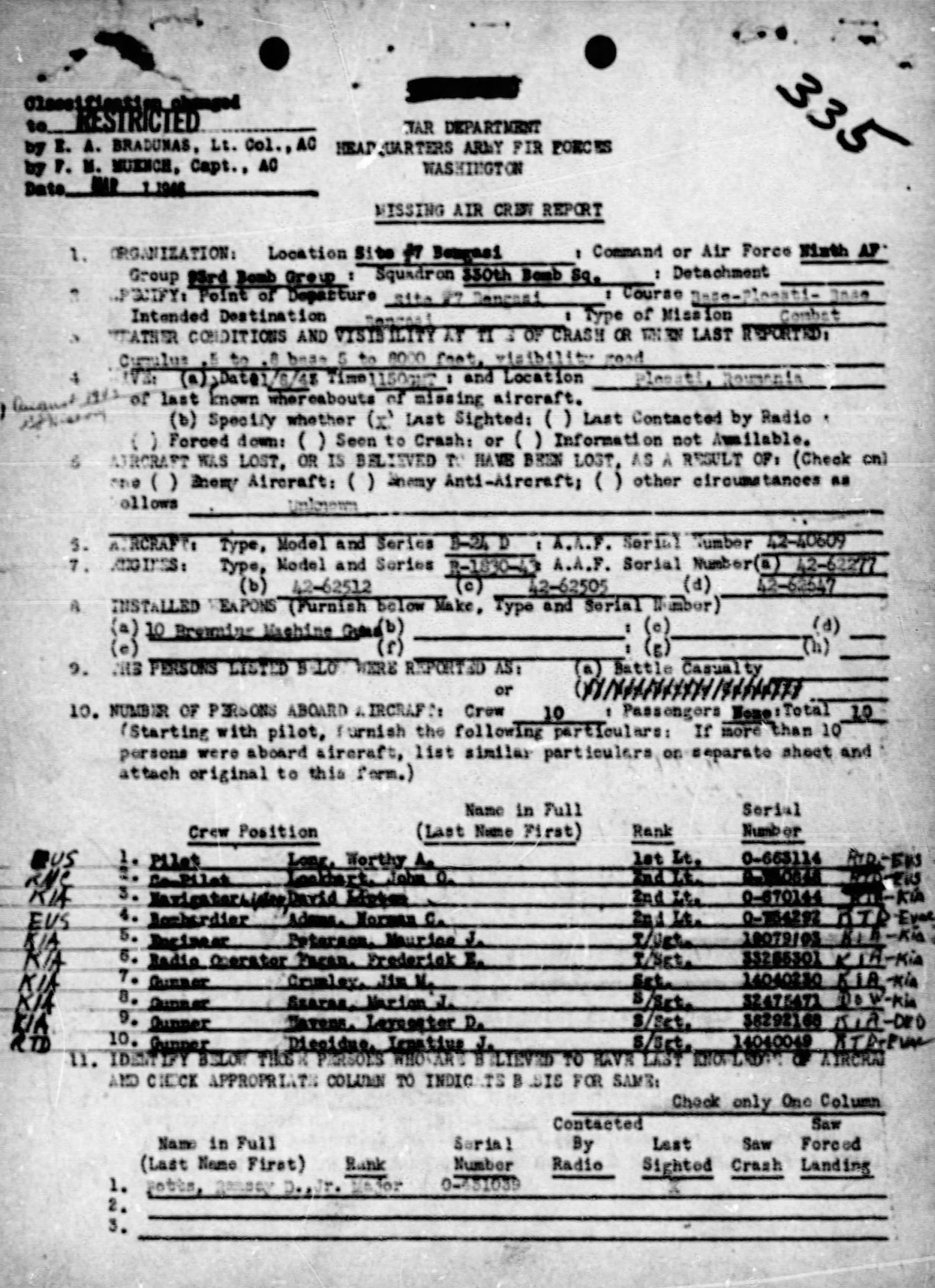 On August 1, 1943, the squadron flew to Benghazi, Libya to participate in Operation Tidal Wave, the low-level bombing of the Polesti Oil Fields, Romania. The plane piloted by Lt Worthy Long was in the right wing position of the second element. As they were approaching the target Romanian fighters attacked from the rear killing the tail gunner SSgt Leycester Havens, the first casualty of the raid. Besides the damage to the tail there was damage to the nose, and wind whistled through the fuselage. Then number 4 engine was knocked out, and a shell blew up the control pedestal. Two flak towers laced each side as she raced between them and the number 1 engine caught fire. Somehow the pilots managed to coax her down into an open field where she slid into a berm and the nose broke away and rolled with Lt Norman Adams, the bombardier, inside. He was unable to hear for three days after the crash. The pilots escaped through the broken nose but suffered burns that required hospitalization. The crew was taken prisoner before the last bomber had flown over. Lt Lipton, the navigator, was struck in the chest, and was burned while trying to exit the plane. He would die of his wounds. SSgt Crumley was killed by flak before the crash. Of the crew of ten, six were killed in action and four became prisoners of war.