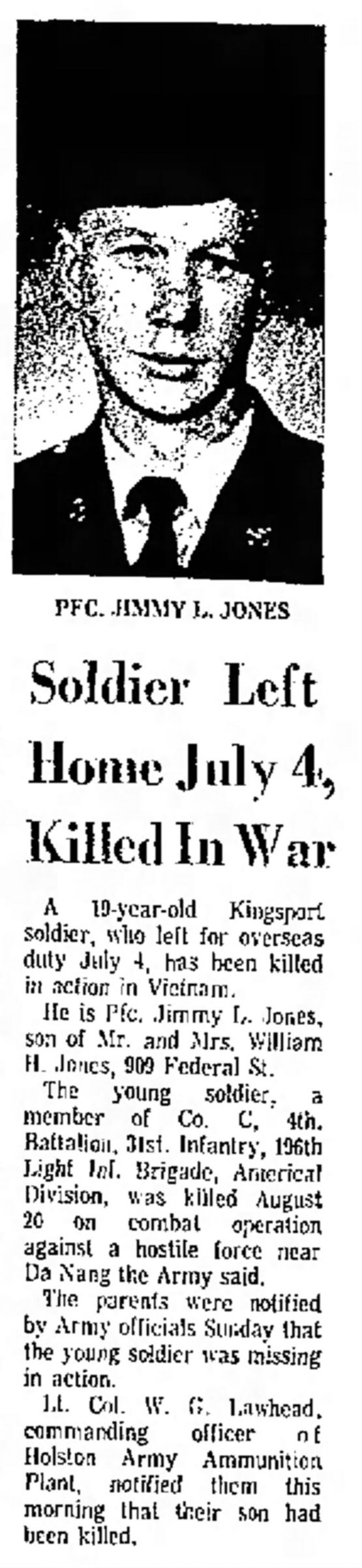 A 19-year-old Kingsport soldier, who left for overseas duty July 4, has been killed in action in Vietnam. He is PFC Jimmy L. Jones, son of Mr. and Mrs. William H. Jones, 909 Federal St.