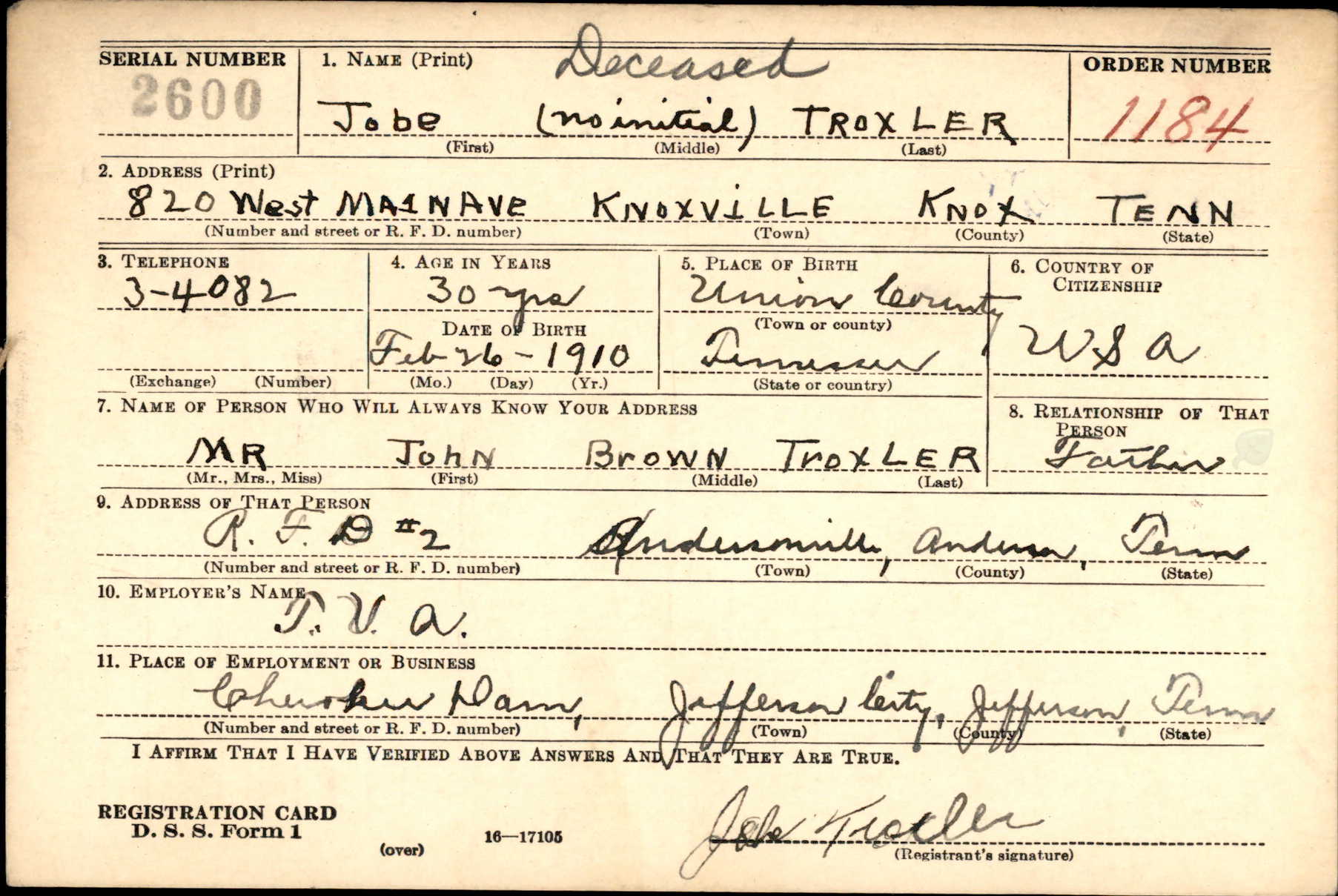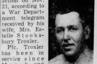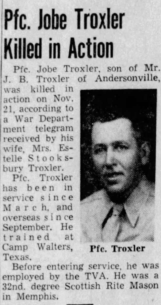 Pfc. Jobe Troxler, son of Mr. J.B. Troxler of Andersonville, was killed in action on Nov. 21, according to a War Department telegram received by his wife, Mrs. Estelle Stooksbury Troxler. Pfc. Troxler has been in service since March, and overseas since September. He trained at Camp Walters, Texas. Before entering service, he was employed by the TVA. He was a 32nd degree Scottish Rite Mason in Memphis.