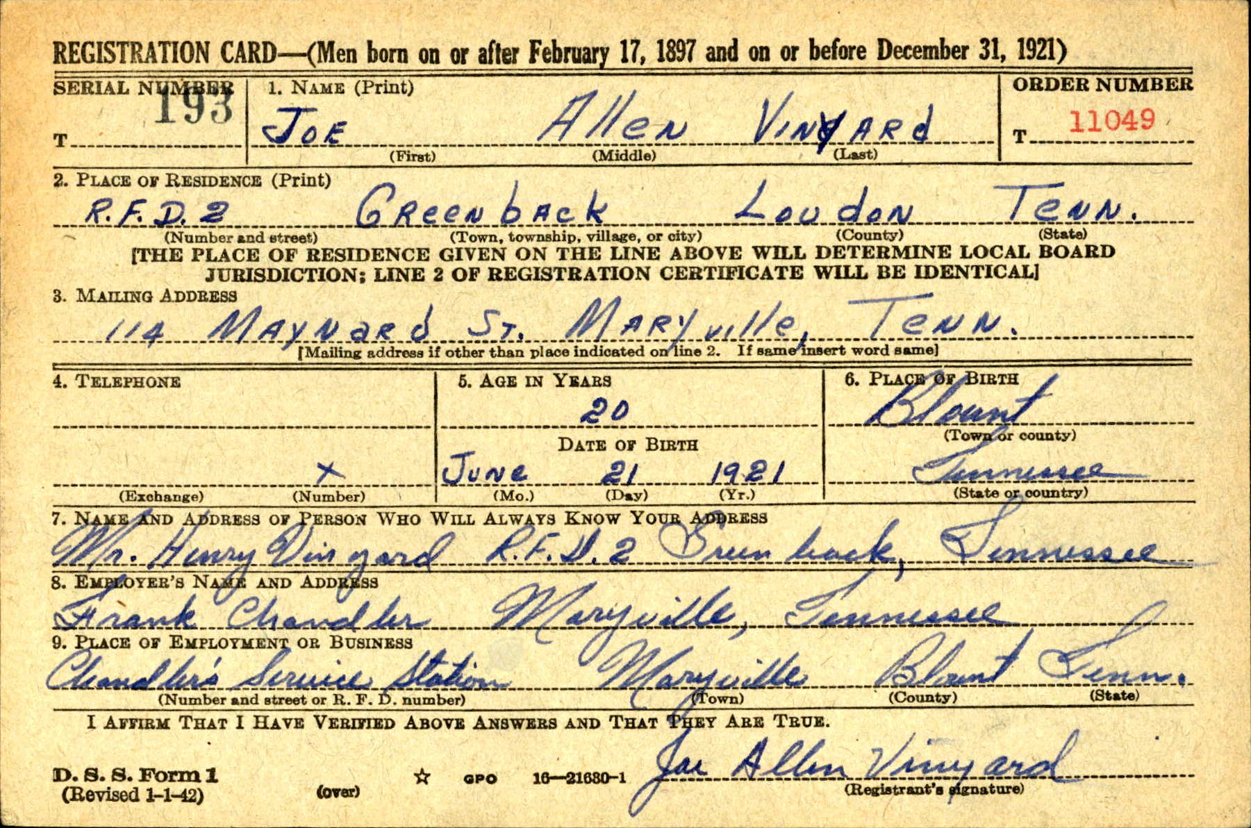 Joe Allen Vinyard was born on 21 June 1921 at Loudon, TN.