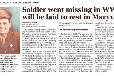 Vinyard’s name is recorded on the Walls of the Missing at the Netherlands American Cemetery, an American Battle Monuments Commission, along with others still missing from WWII. A rosette will be placed next to his name to indicate he has been accounted for.
