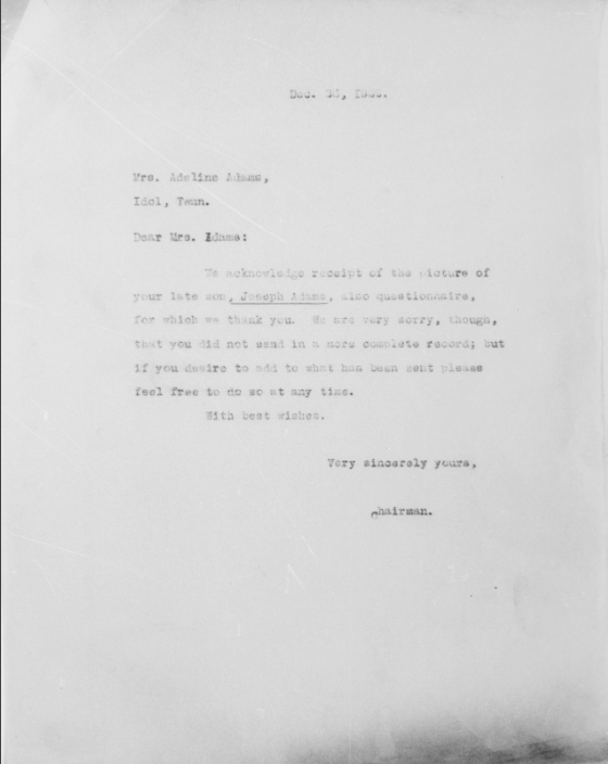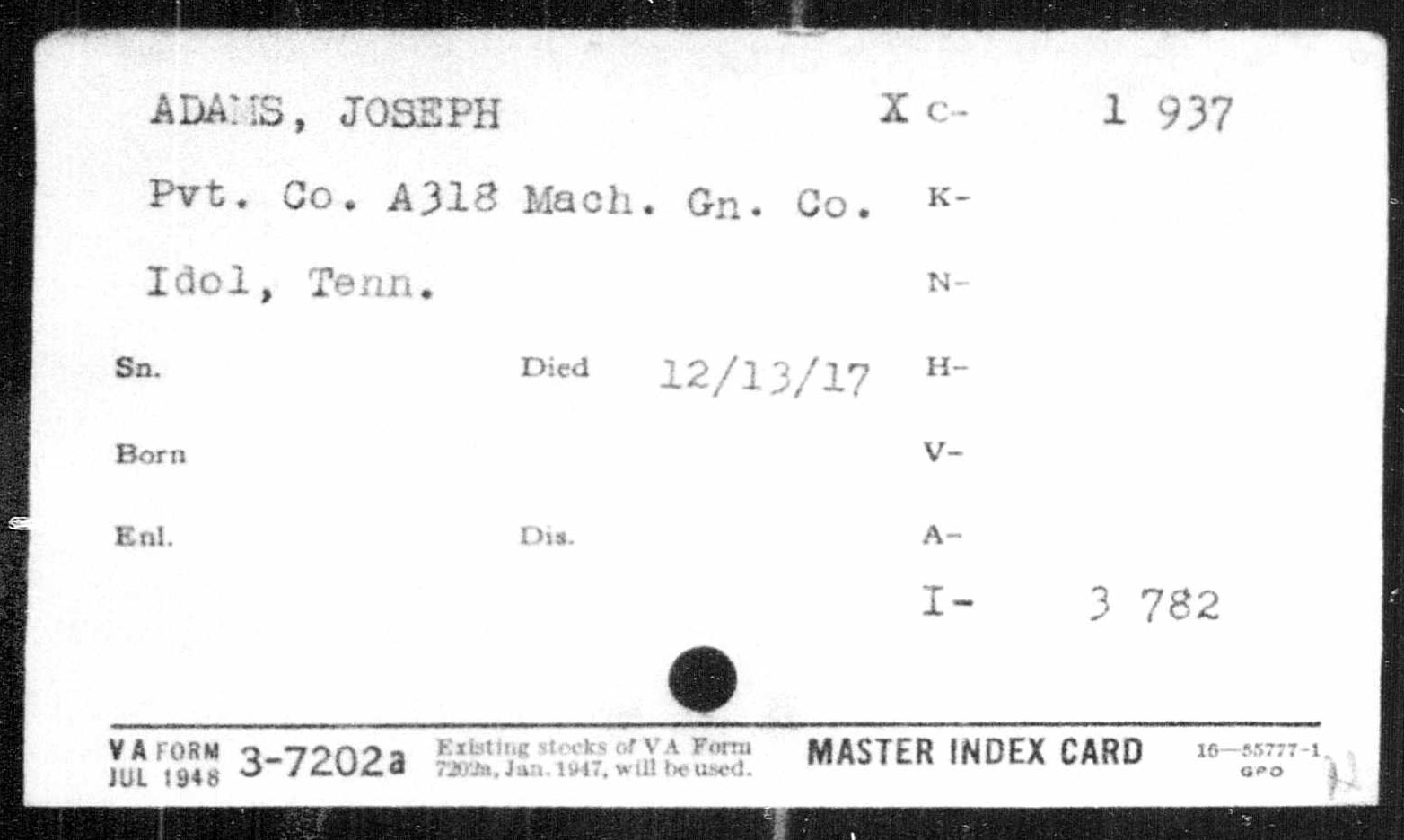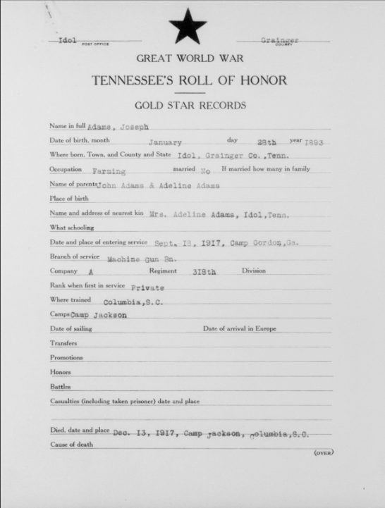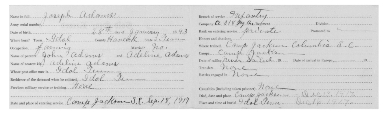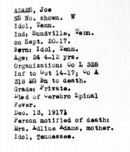 Joseph “Joe” Adams was born in Idol, Tennessee. He died at the age of 24 at Camp Jackson, Columbia, SC of cerebro spinal fever.