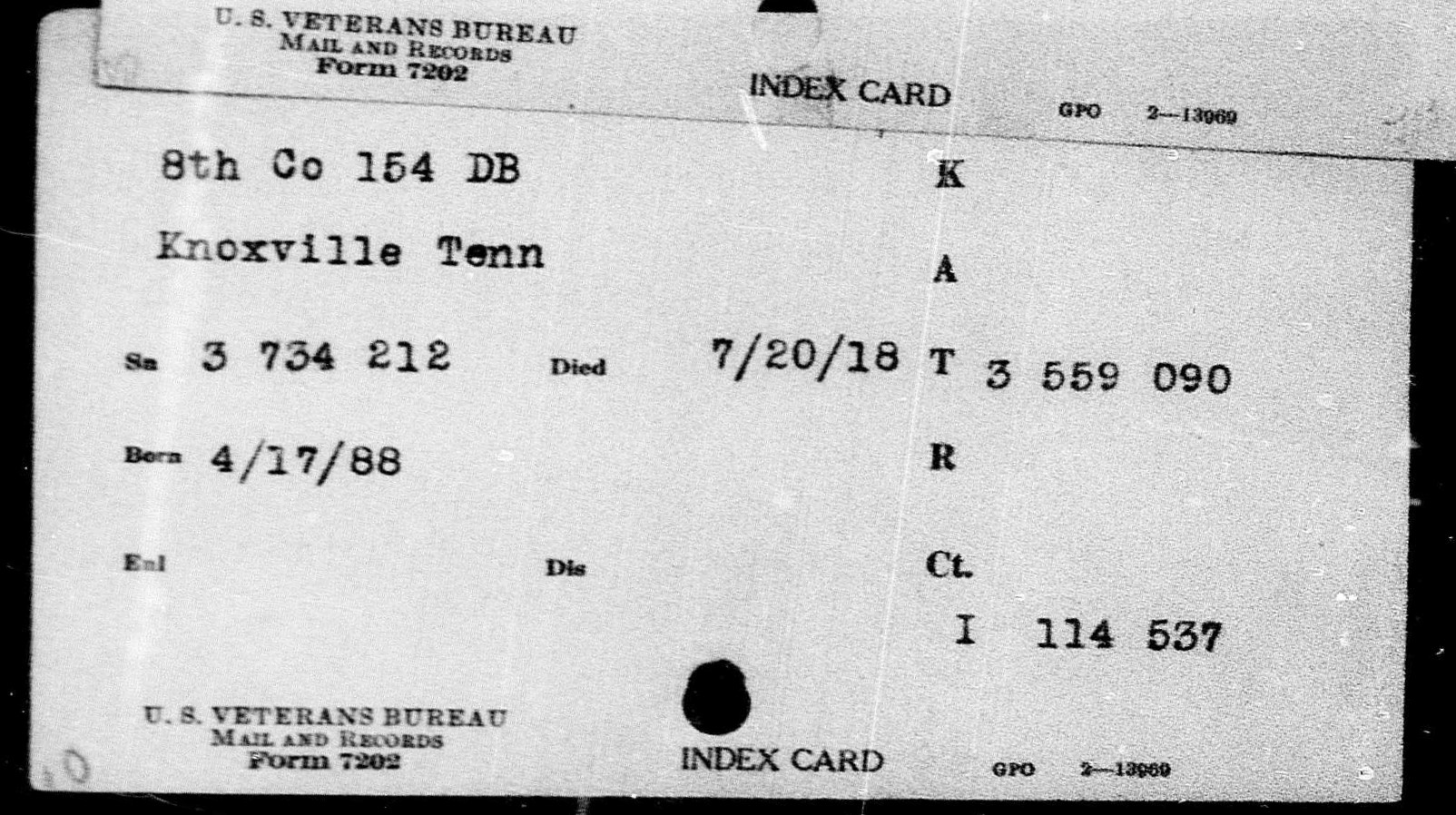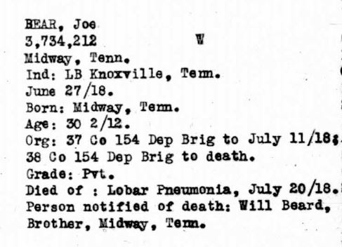 Joe Bear (also spelled as Beard) was born Midway, Greene County, Tennessee. He was the brother of Will Beard of Midway, TN. He entered the service on 2 June 1918 at Knoxville, Tennessee. He died of lobar pneumonia at the age of 30.