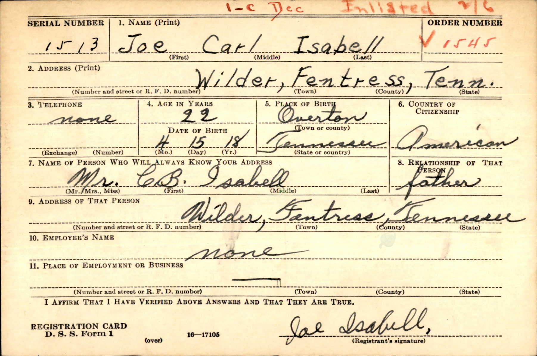 Joe Carl Isabell was born on 15 April 1918, the son of Colonel Beecham Isabell and Minnie Pearl Harris.