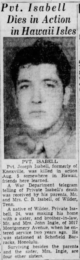 Pvt. Joseph Isabell, formerly of Knoxville, was killed in action Aug. 5, somewhere in Hawaii, friends here learned. A War Department telegram telling of Private Isbell’s death was received by his parents, Mr. and Mrs. C.B. Isabell, of Wilder, Tenn. A native of Wilder, Private Isabell, 24, was making his home with a sister, and brother-in-law, Mr. and Mrs. John Ingle, of 3017 Montgomery Avenue when he entered service two years ago. He was stationed at Schofield Barracks, Honolulu. Surviving besides the parents and the sister, Mrs. Ingle, ar four other sisters.