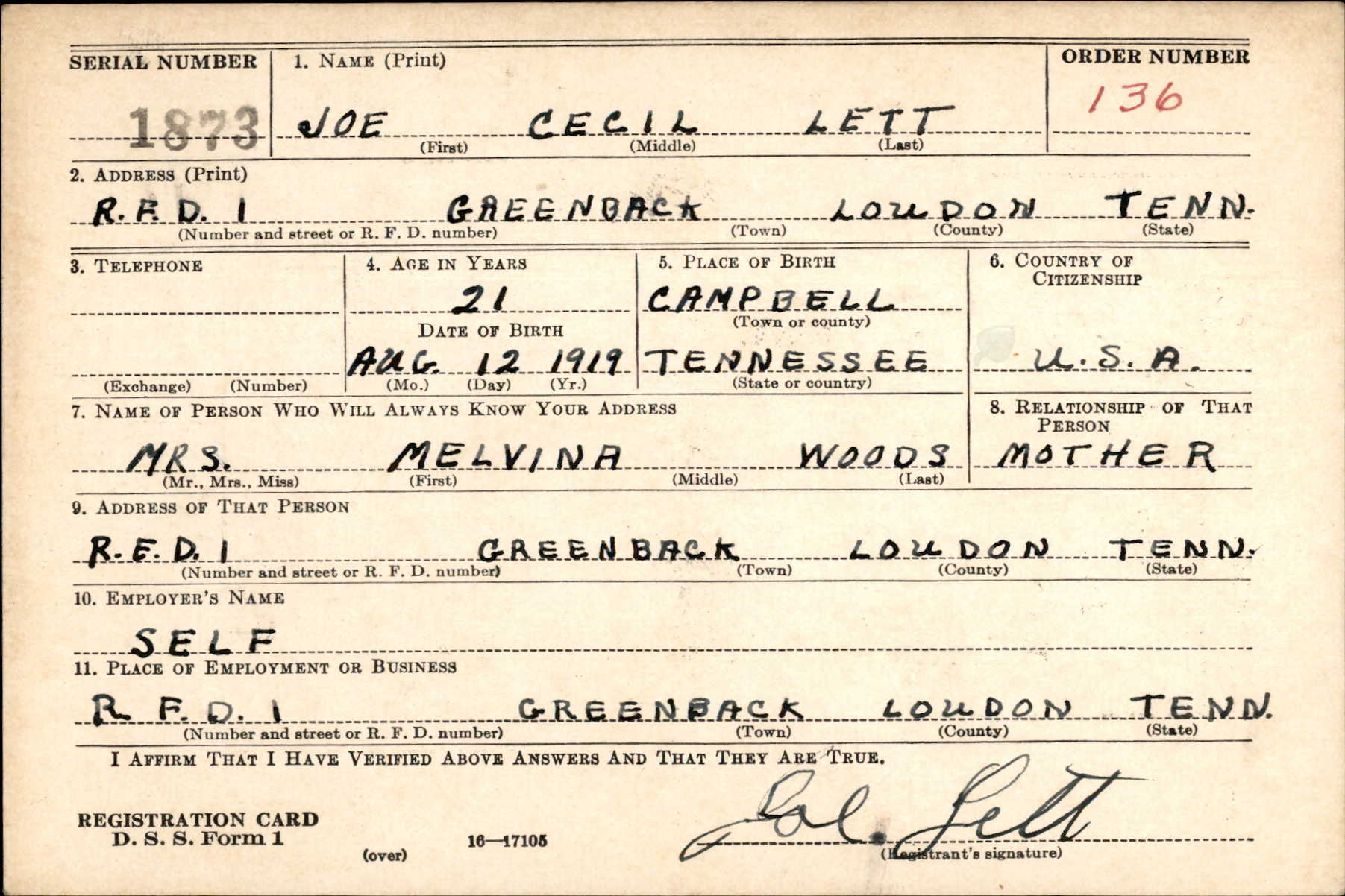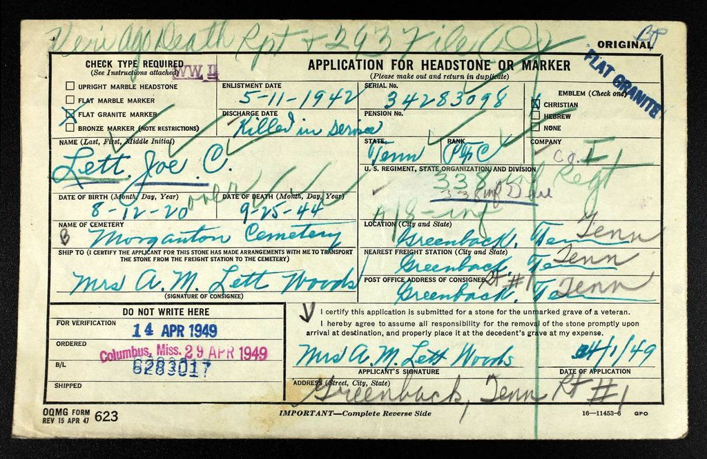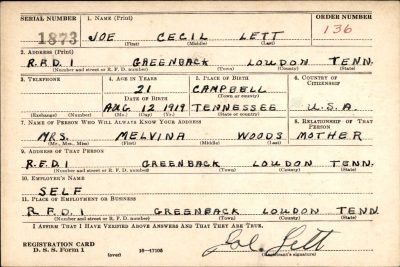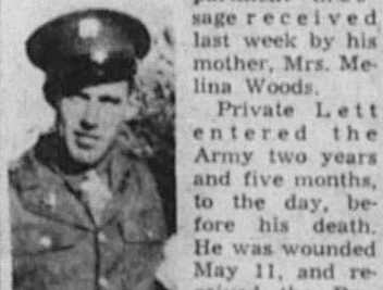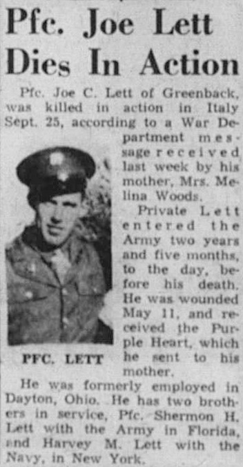 Pfc. Joe C. Lett of Greenback, was killed in action in Italy Sept. 25, according to a War Department message received last week by his mother, Mrs. Melina Woods. Private Lett entered the Army two years and five months, to the day before his death. He was wounded May 11, and received the Purple Heart, which he sent to his mother. He was formerly employed in Dayton, Ohio. He has two brothers in service. Pfc. Shermon H. Lett with the Army in Florida and Harvey M. Lett with the Navy in New York.