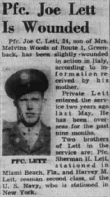 Pfc. Joe C. Lett, 24, son of Mrs. Melvina woods of Route 1, Greenback, has been slightly wounded in action in Italy, according to information received by his mother. Private Lett entered the service two years ago last May. He has been overseas for the past nine months.