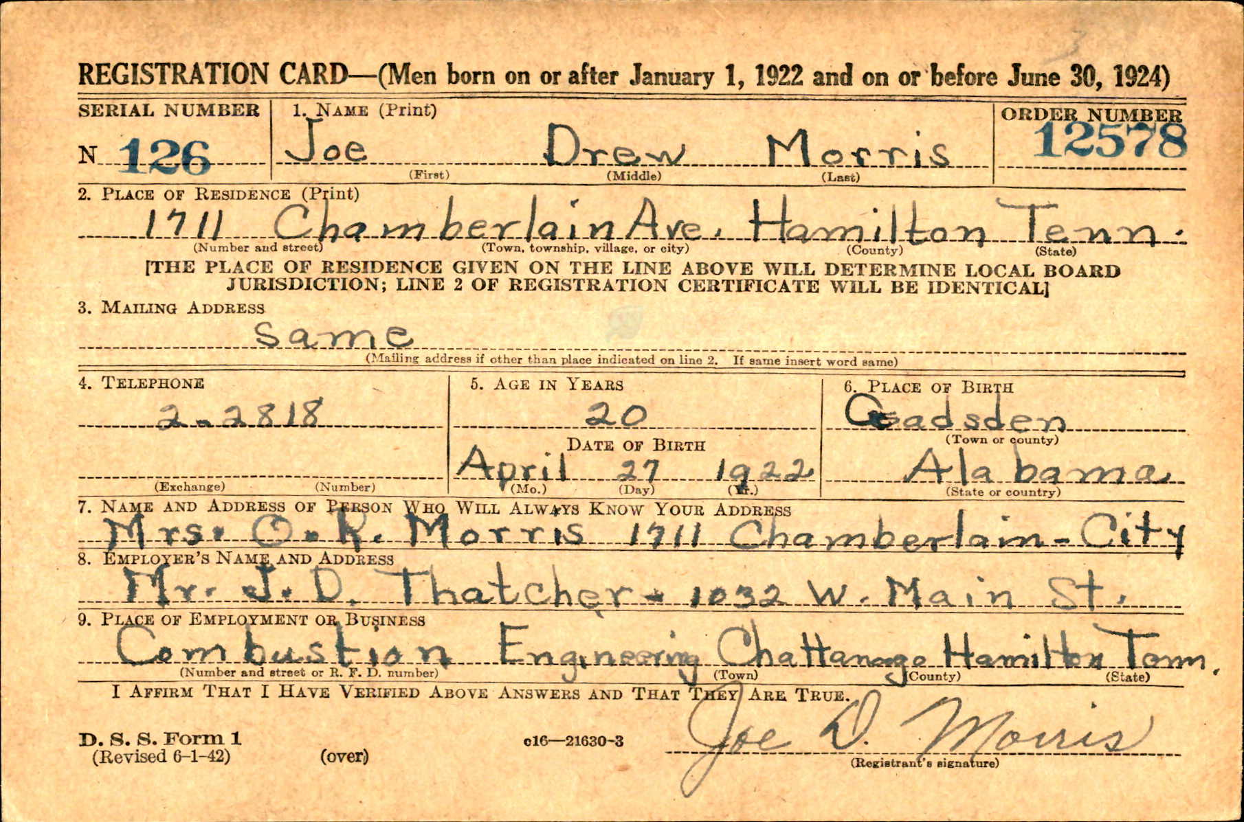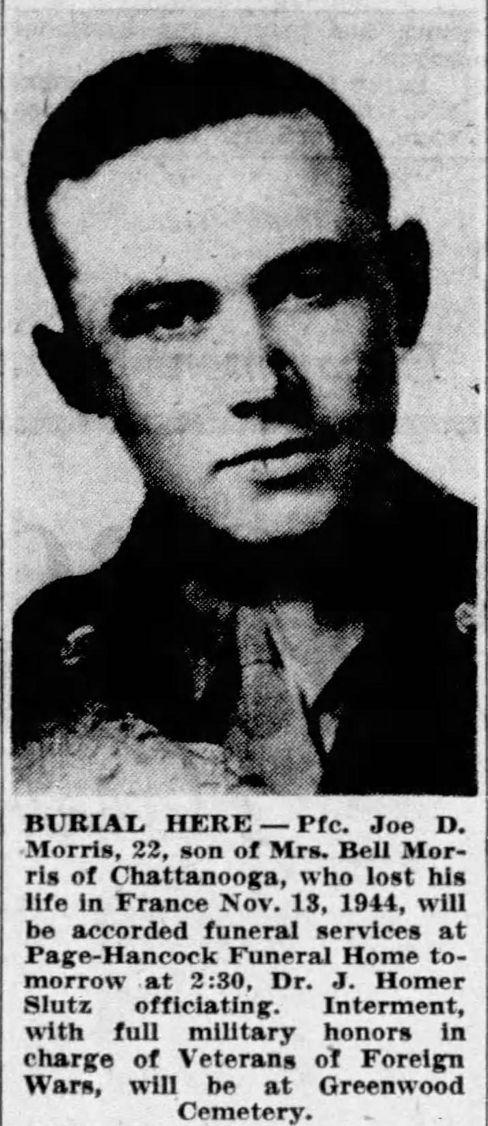 Pfc. Joe Drew Morris was born at Gadsden, Alabama, son of Ollie Robert Morris and Belle Carrie Miller. He enlisted on 20 March 1943 at Fort Oglethorpe in Georgia. He was killed in action in Eastern France.