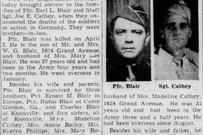 Pfc. Blair was killed on April 3. He is the son of Mr. and Mrs. W.G. Blair, 1624 Grand Avenue, and husband of Mrs. Mary Lee Blair. He was 37 years old and had been in the Army four years and two months. He went overseas in January. Besides his wife and parents, Pfc. Blair is survived by three brothers, Pvt. Ernest M. Blair in Europe, Pvt. Rufus Blair at Camp Gordon, Ga., and Charles Blair of Knoxville; five sisters, all of Knoxville, Mrs. Madeline Cathey, Mrs. Annie Bailey, Mrs. Evelyn Phillips, Mrs. Mary Bohannon and Miss Florence Blair.