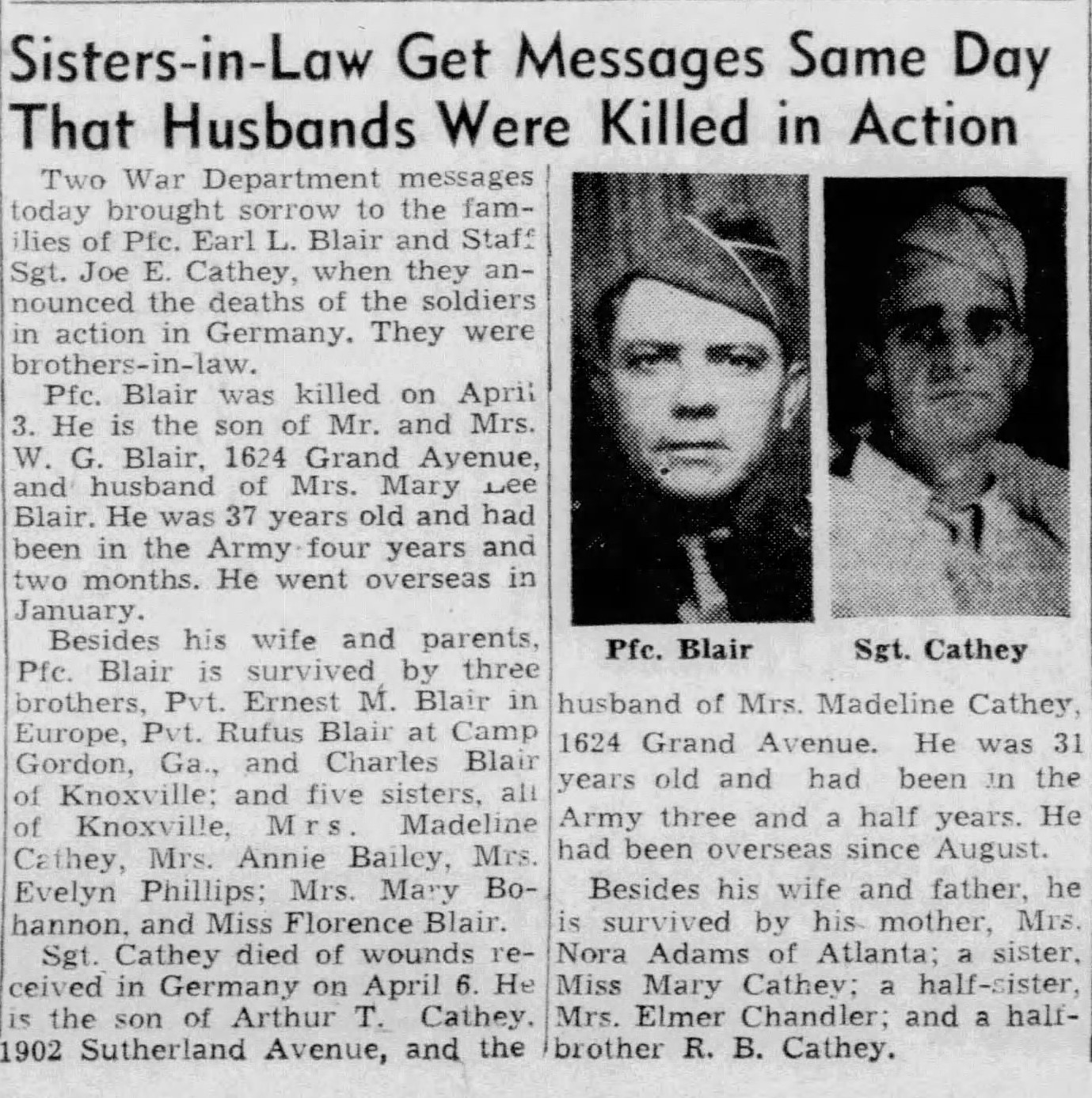Two War Department messages today brought sorrow to the families of Pfc. Earl L. Blair and Staff Sgt. Joe E. Cathey, when they announced the deaths of the soldiers in action in Germany. They were brothers in law.