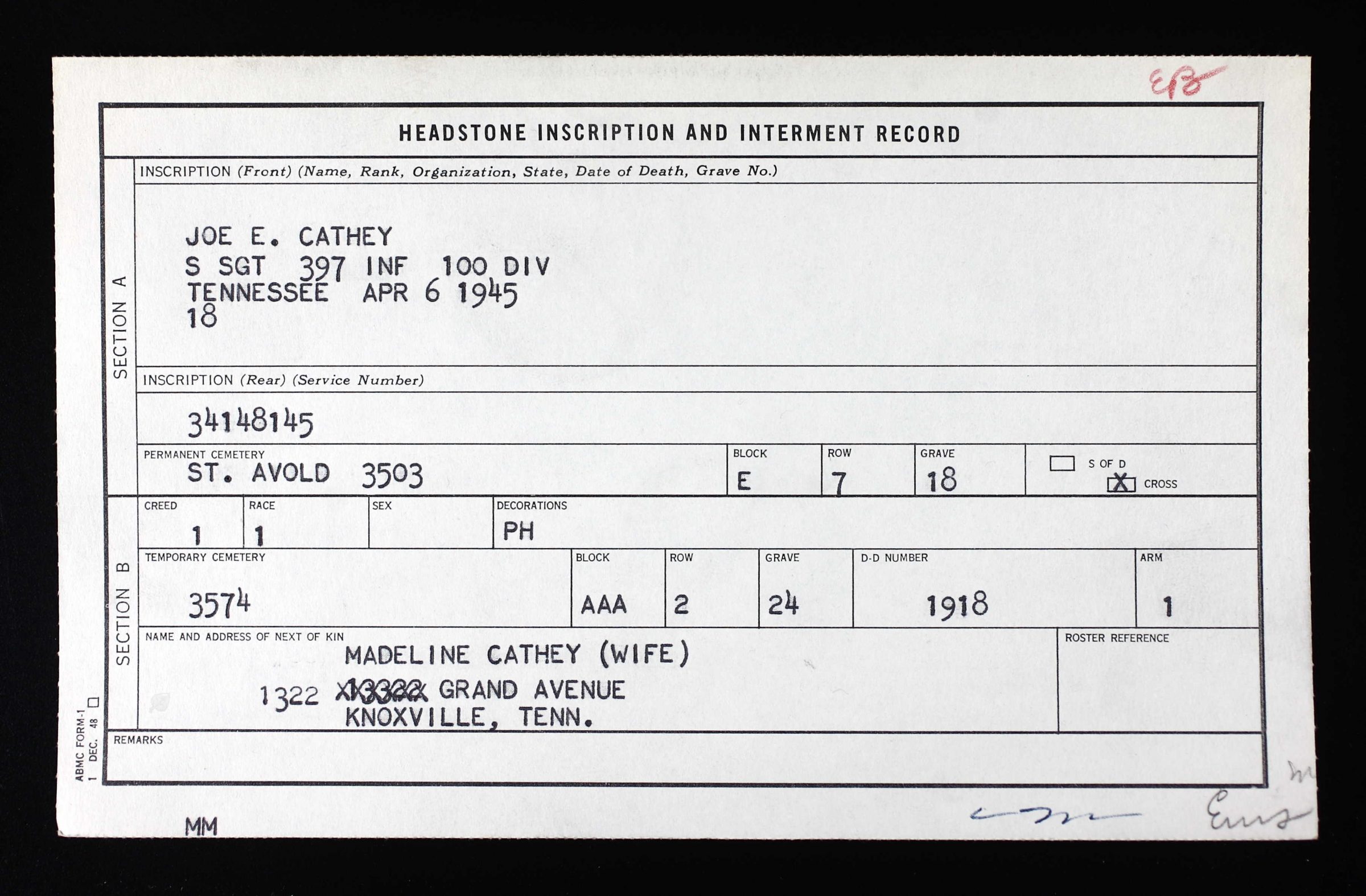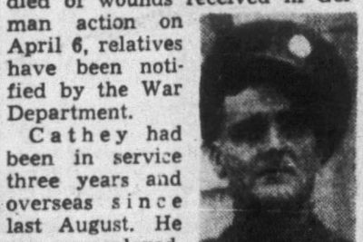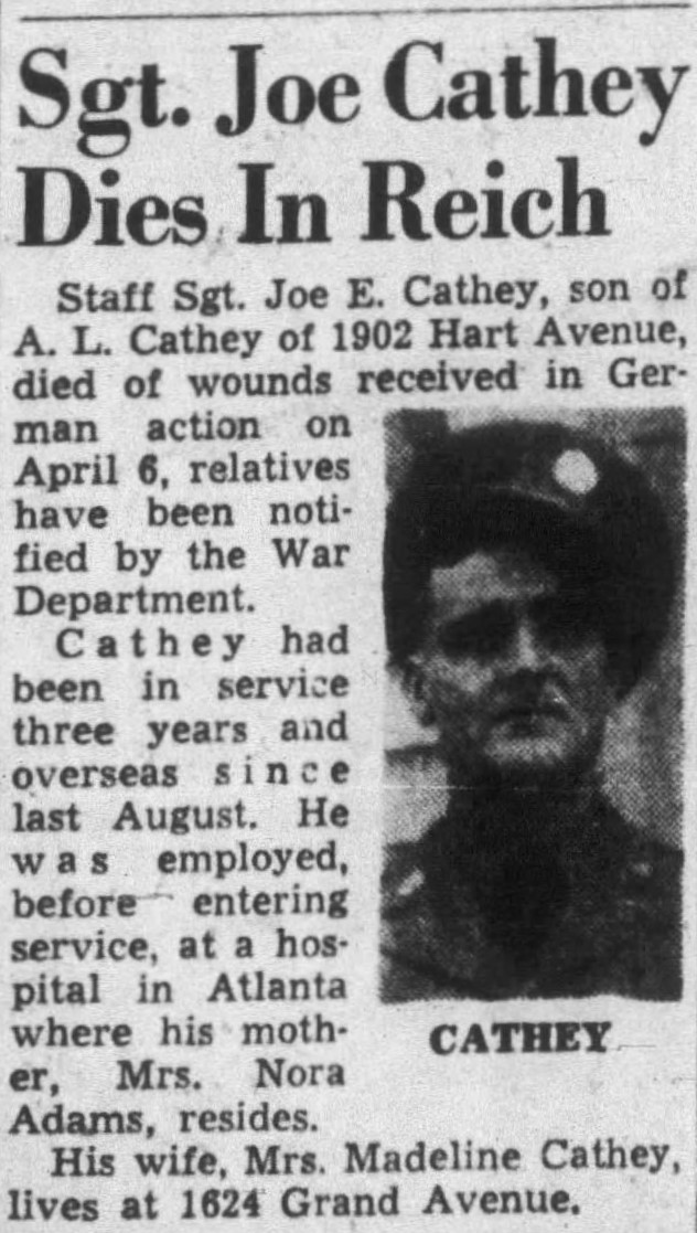 Sgt. Cathey died of wounds received in Germany on April 6. He is the son of Arthur T. Cathey, 1902 Sutherland Avenue, and the husband of Mrs. Madeline Cathey, 1624 Grand Avenue. He was 31 years old and had been in the Army three and a half years. He had been overseas since August. Besides his wife and father, he is survived by his mother, Mrs. Nora Adams of Atlanta; a sister, Miss Mary Cathey; a half-sister, Mrs. Elmer Chandley; and a half-brother R.B. Cathey.