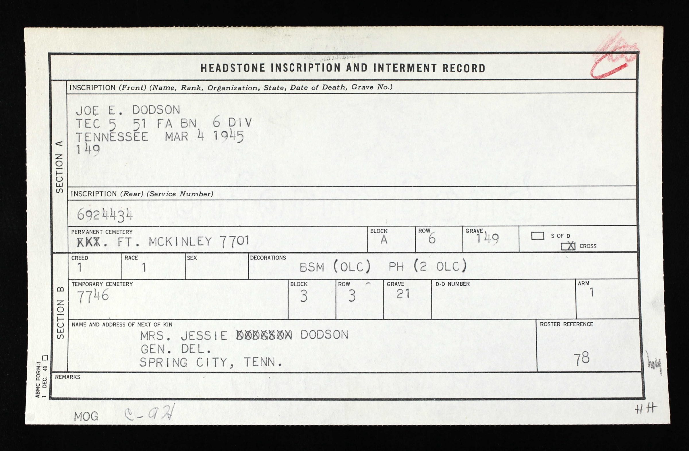 Tec5 Dodson was killed in action on the 4th of March 1945. He was interred at the Manila American Cemetery, Philippines, plot A, row 6, grave 149.