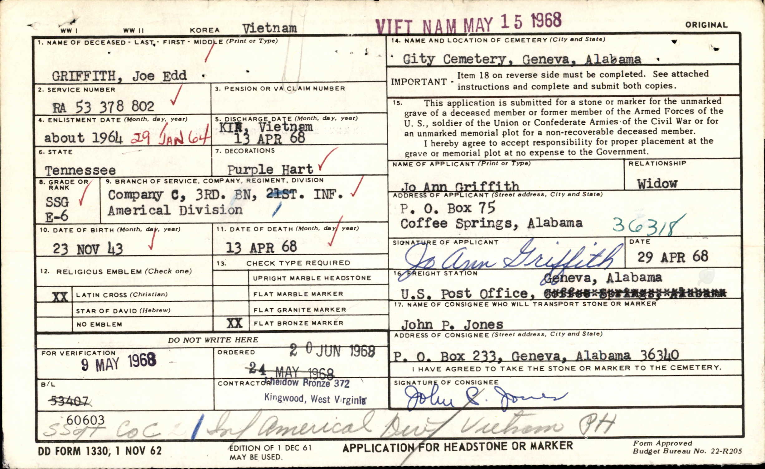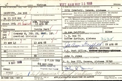 Joe Edward “Edd” Griffith was the son of Mr. and Mrs. Sylvester Griffith of Brimstone Road, Robbins. He attended Robbins High School for three years and joined the Army in 1964, later obtaining his high school diploma. He re-enlisted for six years in January, 1966, and had four more years to serve. Sgt Griffith was married to the former Jo Ann Clements of Coffee Springs, Alabama and was the father of a 9-month-old son, Joey. His wife and child lived in Alabama. He had previously been in Vietnam for seven months but was returned to the United States and was stationed for a year at Fort Rucker, Ala., before being sent back to Vietnamon December 24.