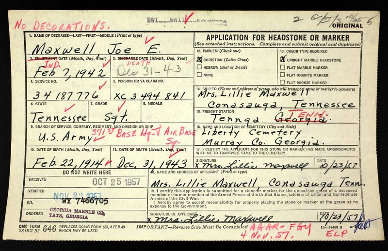 Sgt MaxwellDied non Battle 31 December 1943 at McCloskey General Hospital in Temple, Bell County at Texas of Multiple Sclerosis.