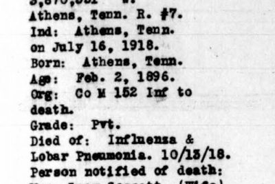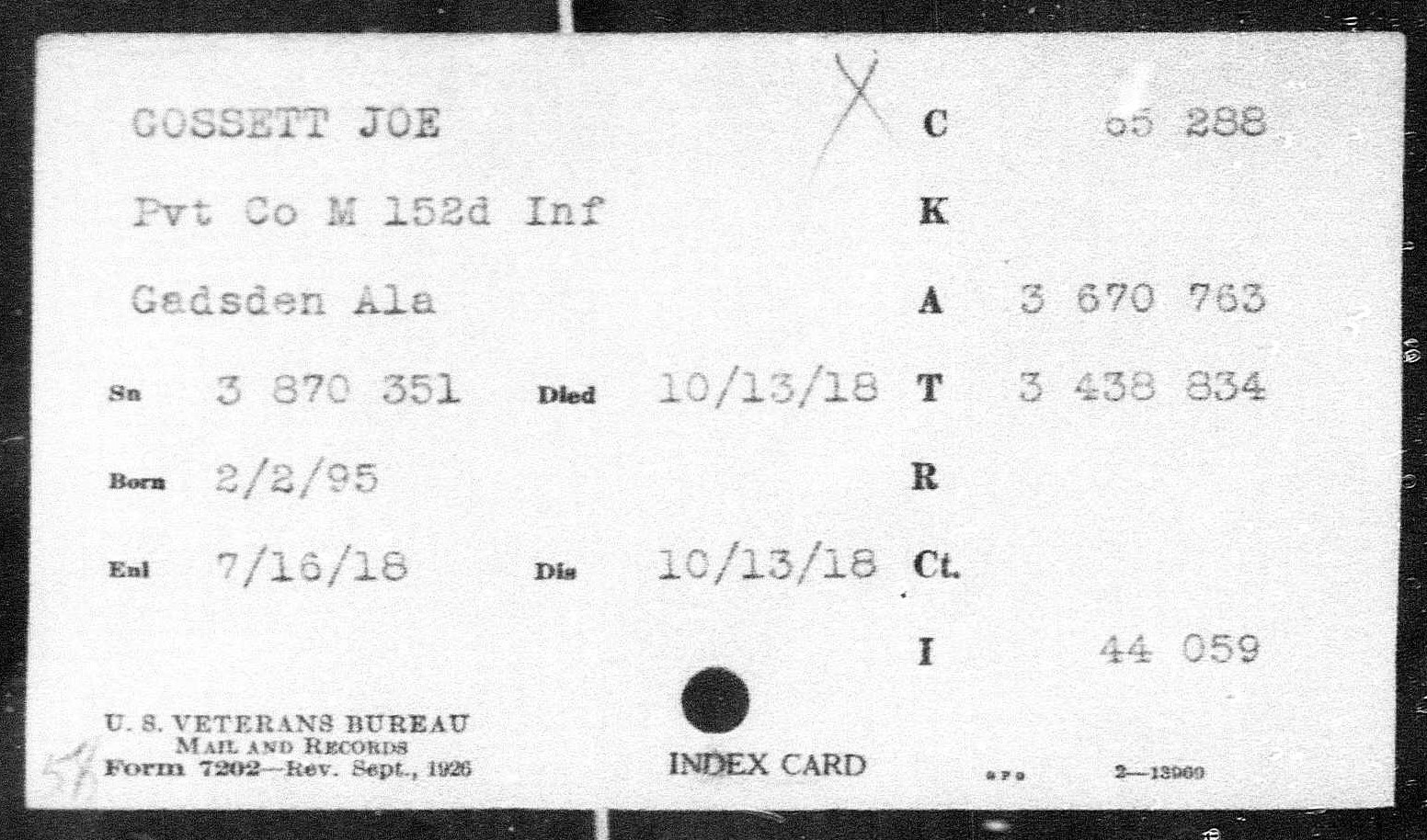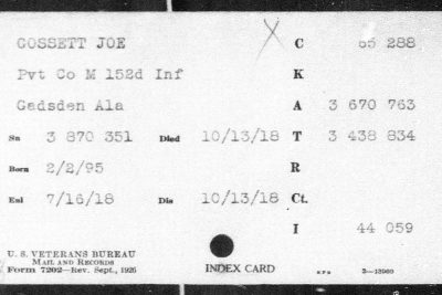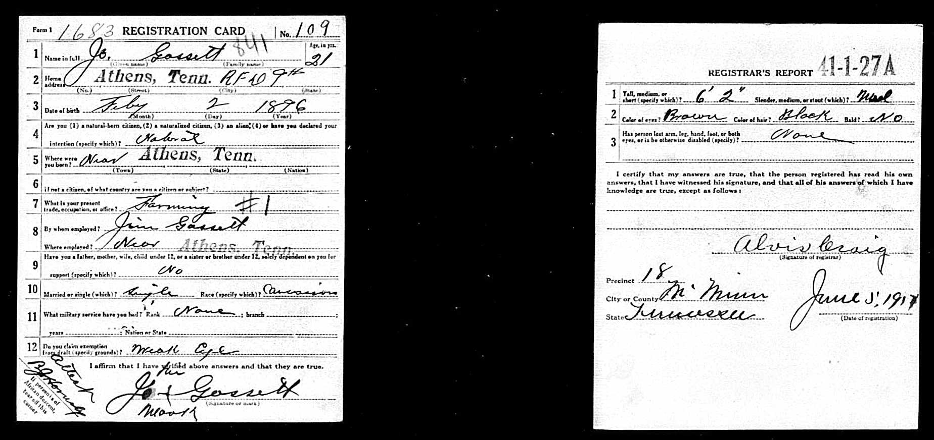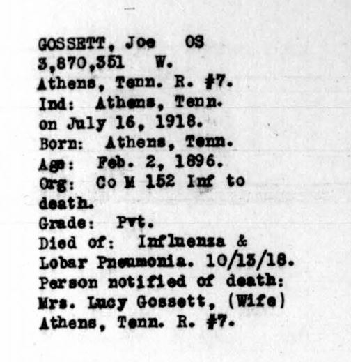 Joe Gossett was born in 1896 in Athens, Tennessee, husband of Lucy Gossett. He died of lobar pneumonia in New York while awaiting shipment to France.