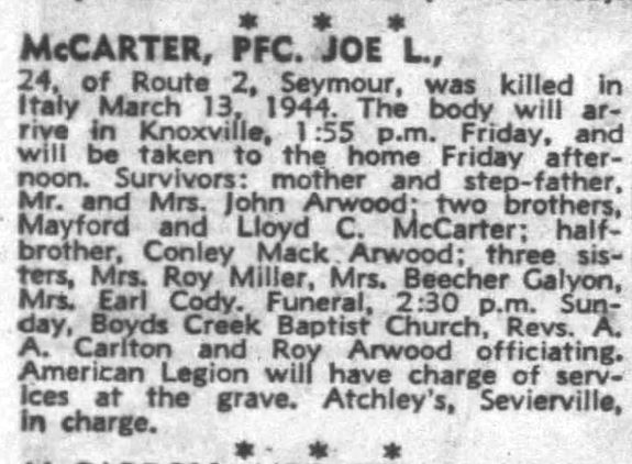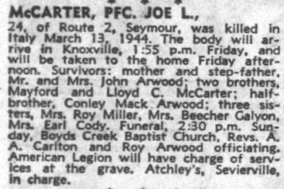 He was Killed in Action 13 March 1944 in Italy. He is buried at Boyds Creek Cemetery, Sevier County in Tennessee.