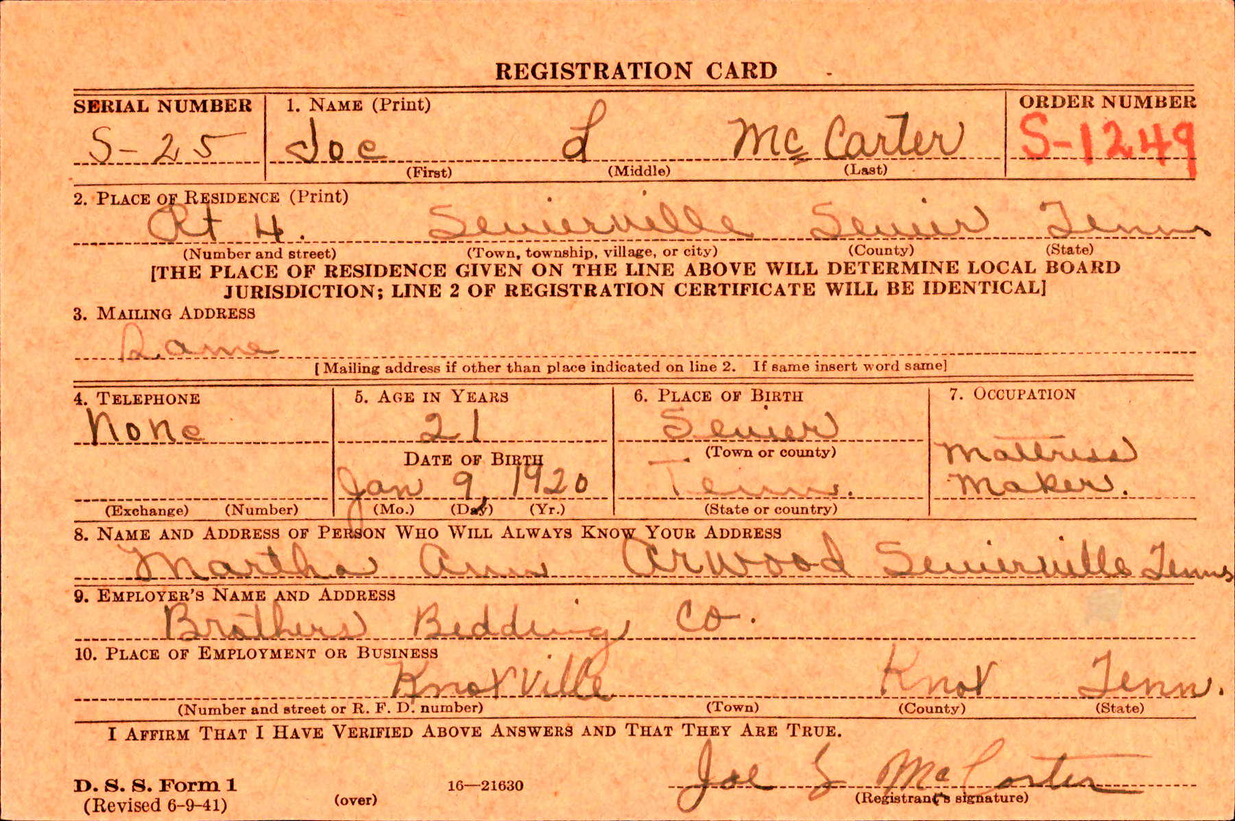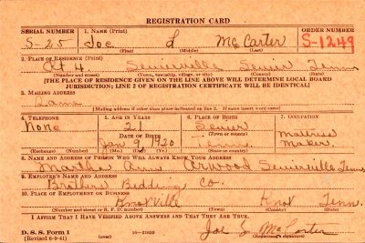 Joe McCarter was born on 9 January 1920, the son of James Wiley McCarter and Martha Anna Ogle. Stepson of John Henry Arwood.