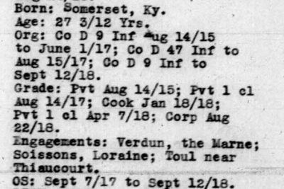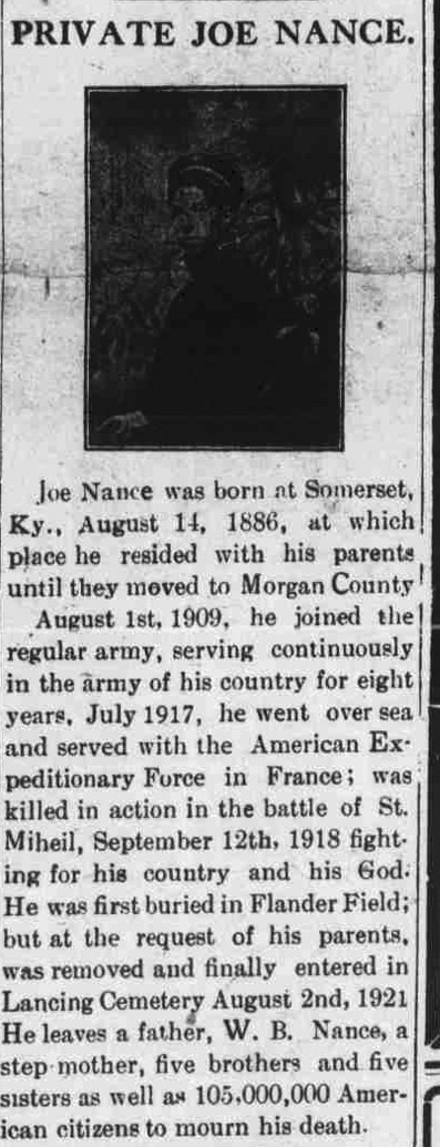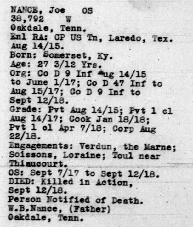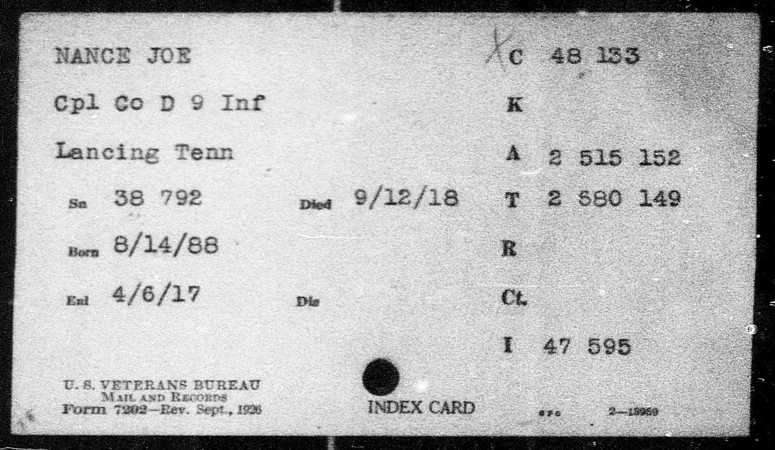 Joe Nance was born on August 14, 1888 in Morgan County, Tennessee. He served with the American Expeditionary Force in France and was killed in action in the battle of St. Mihiel September 12, 1918. He was initially buried at Flanders Field but was removed and finally interred in Lancing Cemetery in 1921.