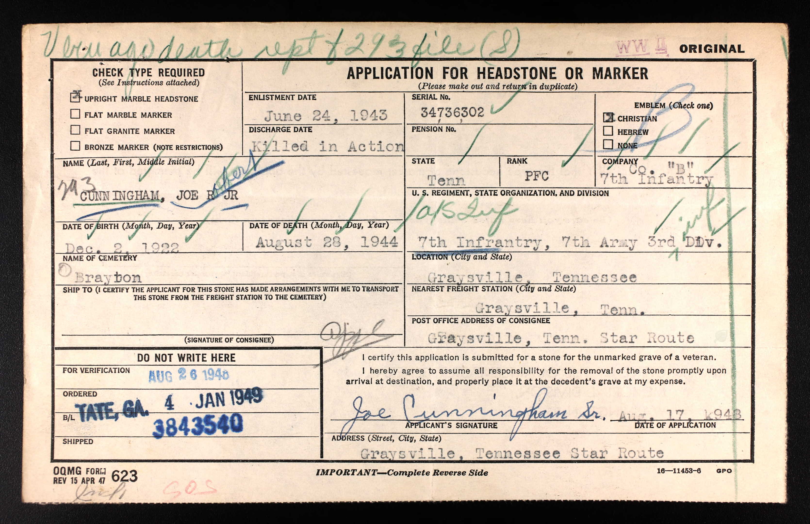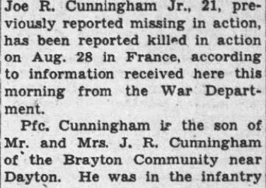 Pfc. Joe R. Cunningham Jr., 21, previously reported missing in action, has been reported killed in action on Aug. 28 in France, according to information received here this morning from the War Department. Pfc. Cunningham is the son of Mr. and Mrs. J.R. Cunningham of the Brayton Community near Dayton. He was in the infantry and had been in the service since June 24, 1943. He had been in Italy on the Anzio Beachhead. He was in south France only 13 days when killed. Besides his parents he is survived by twin brother, Wayne Arle Cunningham and Wade Earl Cunningham, who are now in the U.S. Army in France.