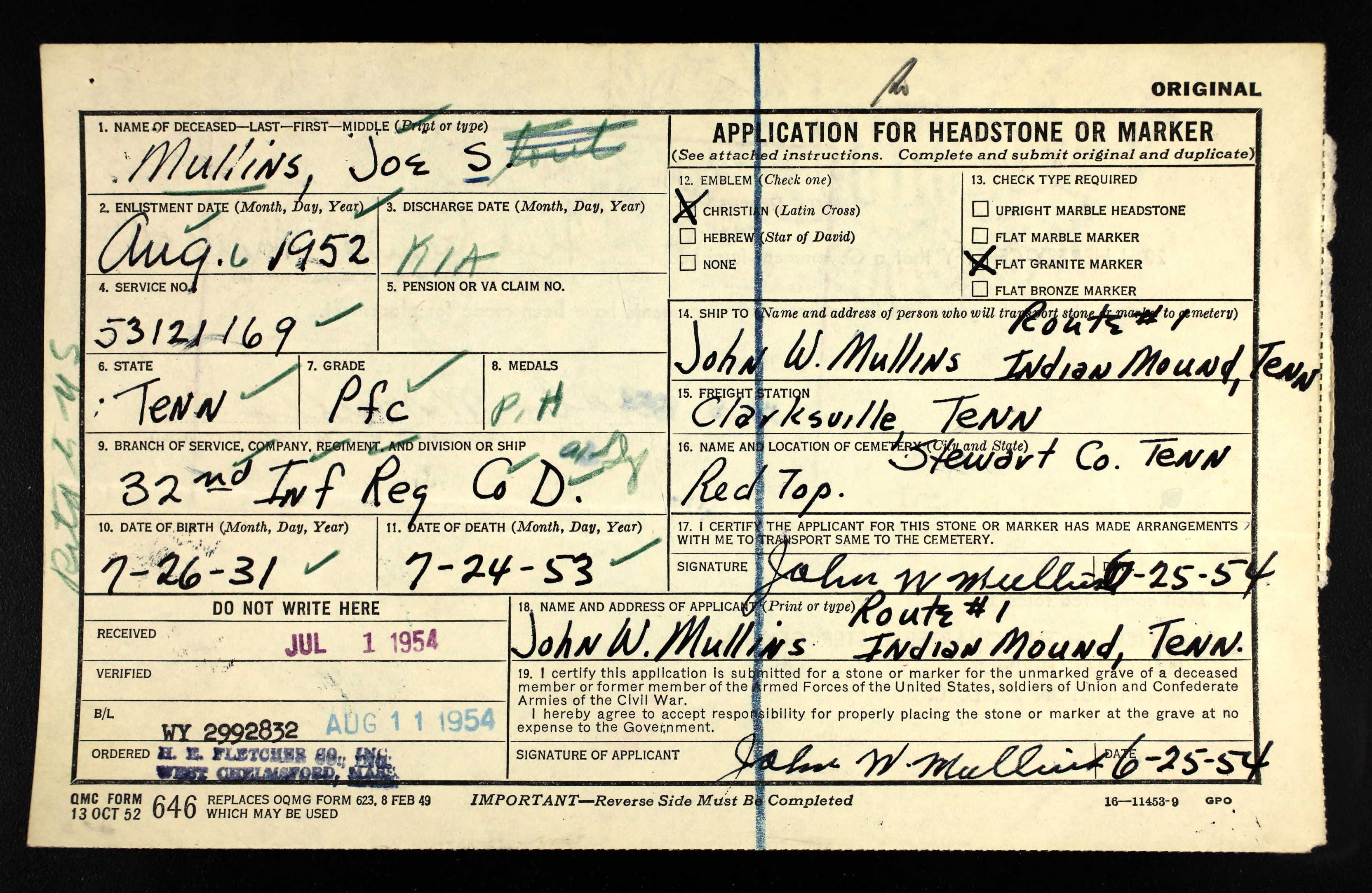 Private First Class Joe Stout Mullins was born around 1931. He was the son of Mr. and Mrs. John B. Mullins. Private First Class Mullins was a Light Weapons Infantryman with Company D, 32nd Infantry Regiment, 7th Infantry Division. He was seriously wounded by a missile near Pork Chop Hill, North Korea on July 24, 1953. He died of those wounds later that day. Private First Class Mullins is buried in Fairview Cemetery in Dover, Tennessee.