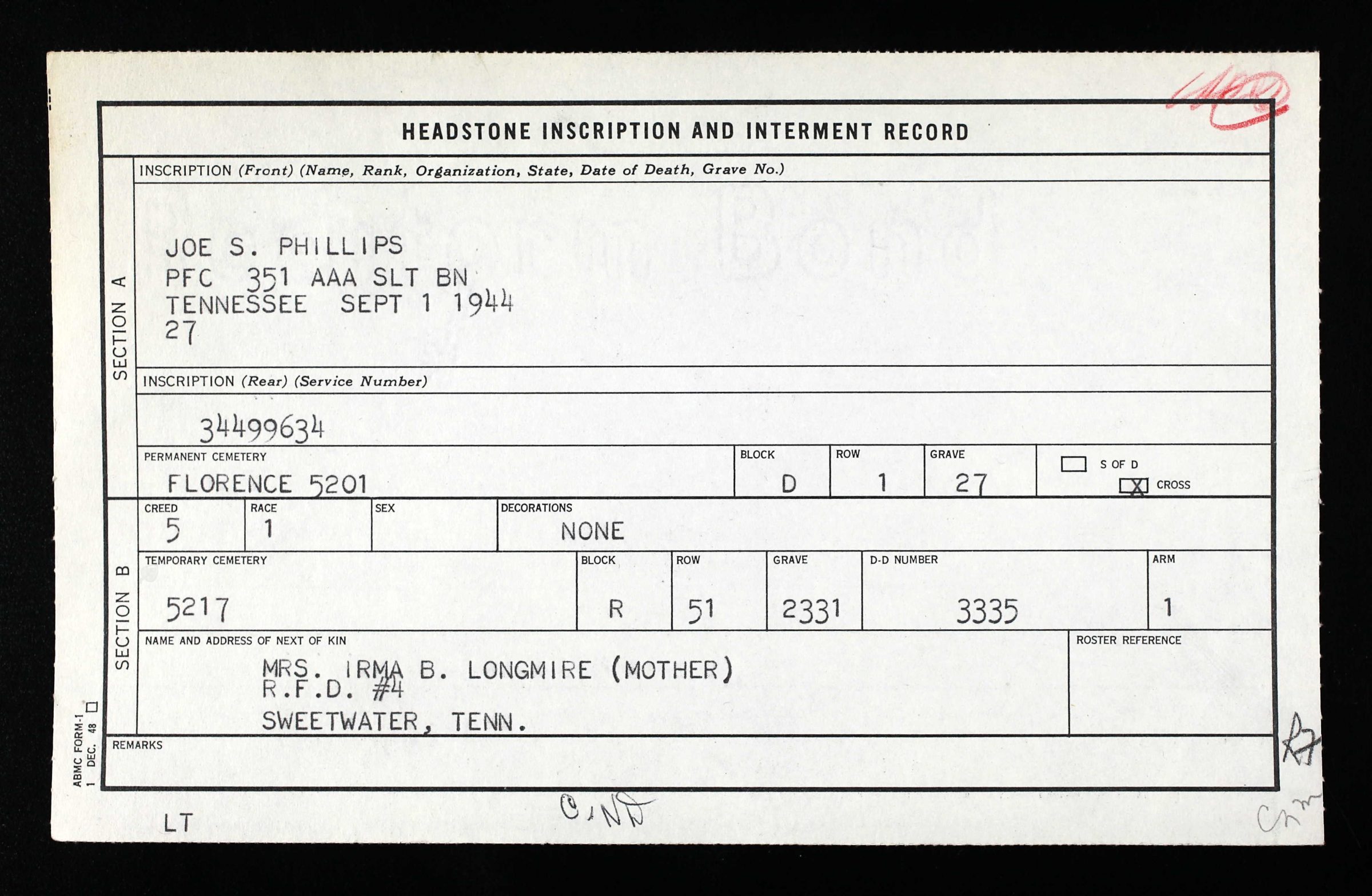 He Died Non Battle in Italy and was initially buried at Castelfiorentiono Cemetery at Castelfiorentino, Italy. He was reburied at Florence American Cemetery, Via Cassia, Italy, Plot D Row 1 Grave 27.