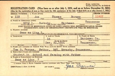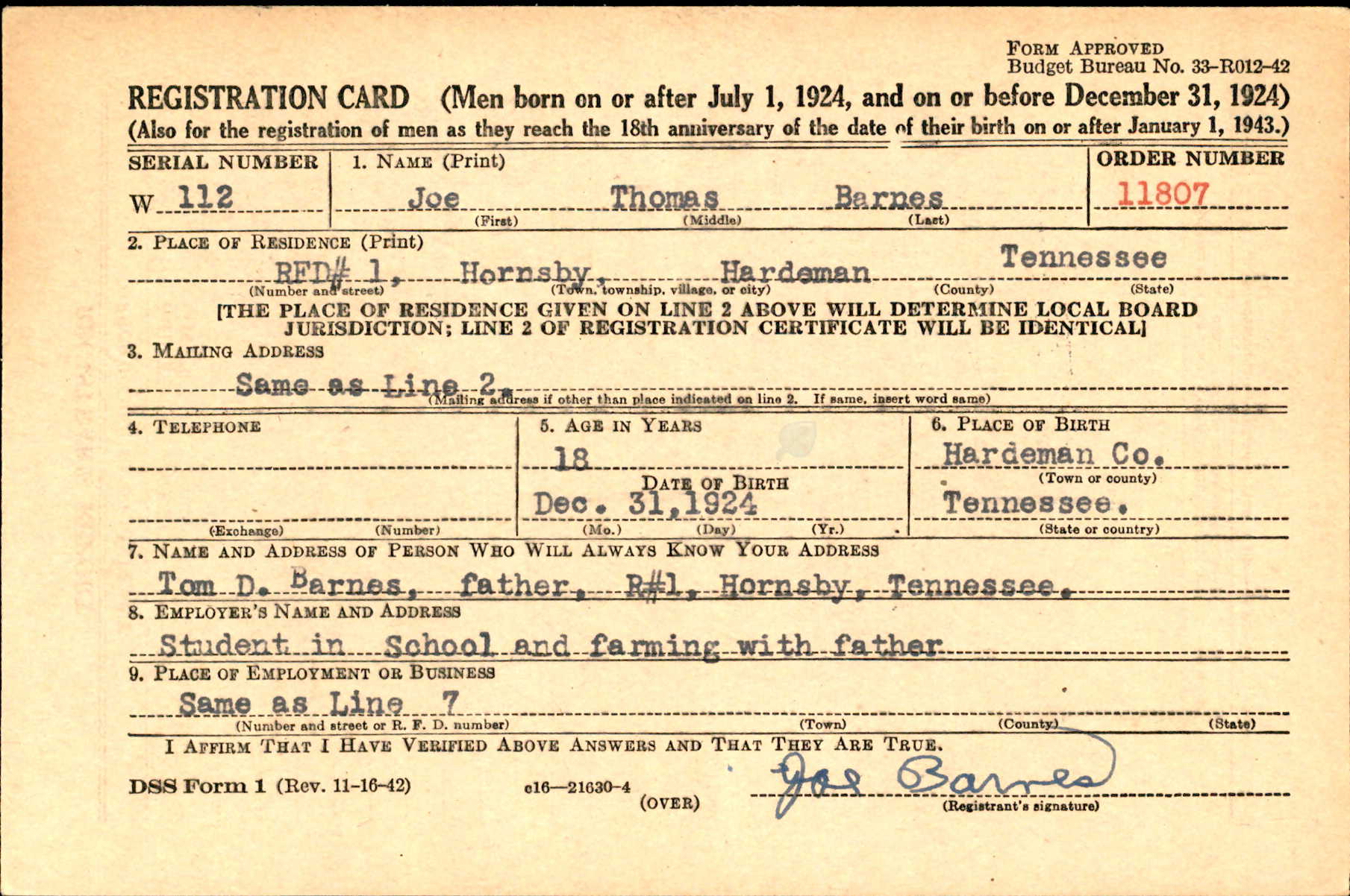Joe Thomas Barnes was born on 24 December 1924, the son of Tom Dallas Barnes and Sarah Erema Fawcett.