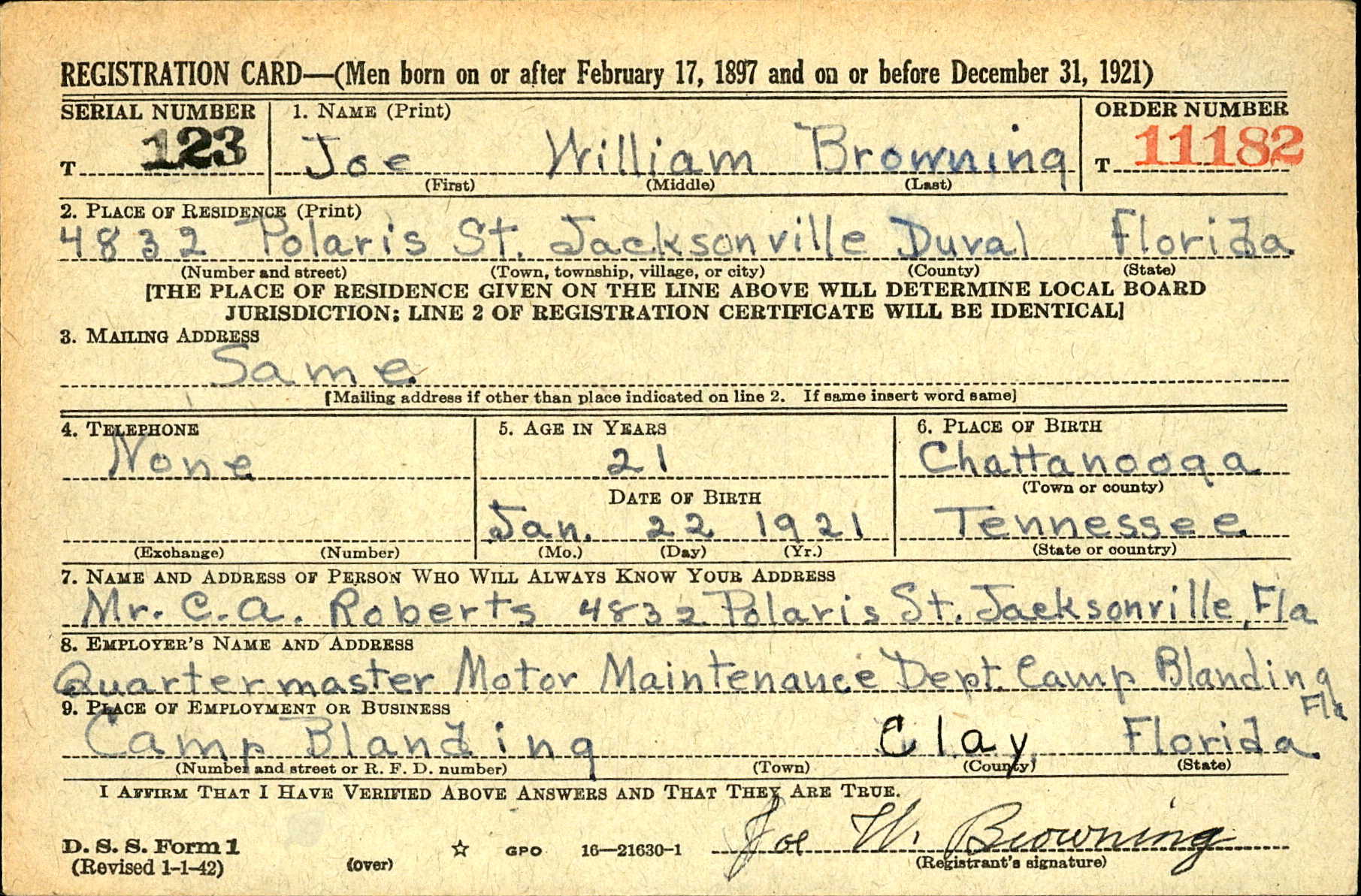 Joe William Browning was born in Chattanooga, the son of Joe H. “Judd” Browning and Elma Cooper. He was married to Dorothy Geraldine Julian. Father of Cynthia Marie and Joe William Browning.