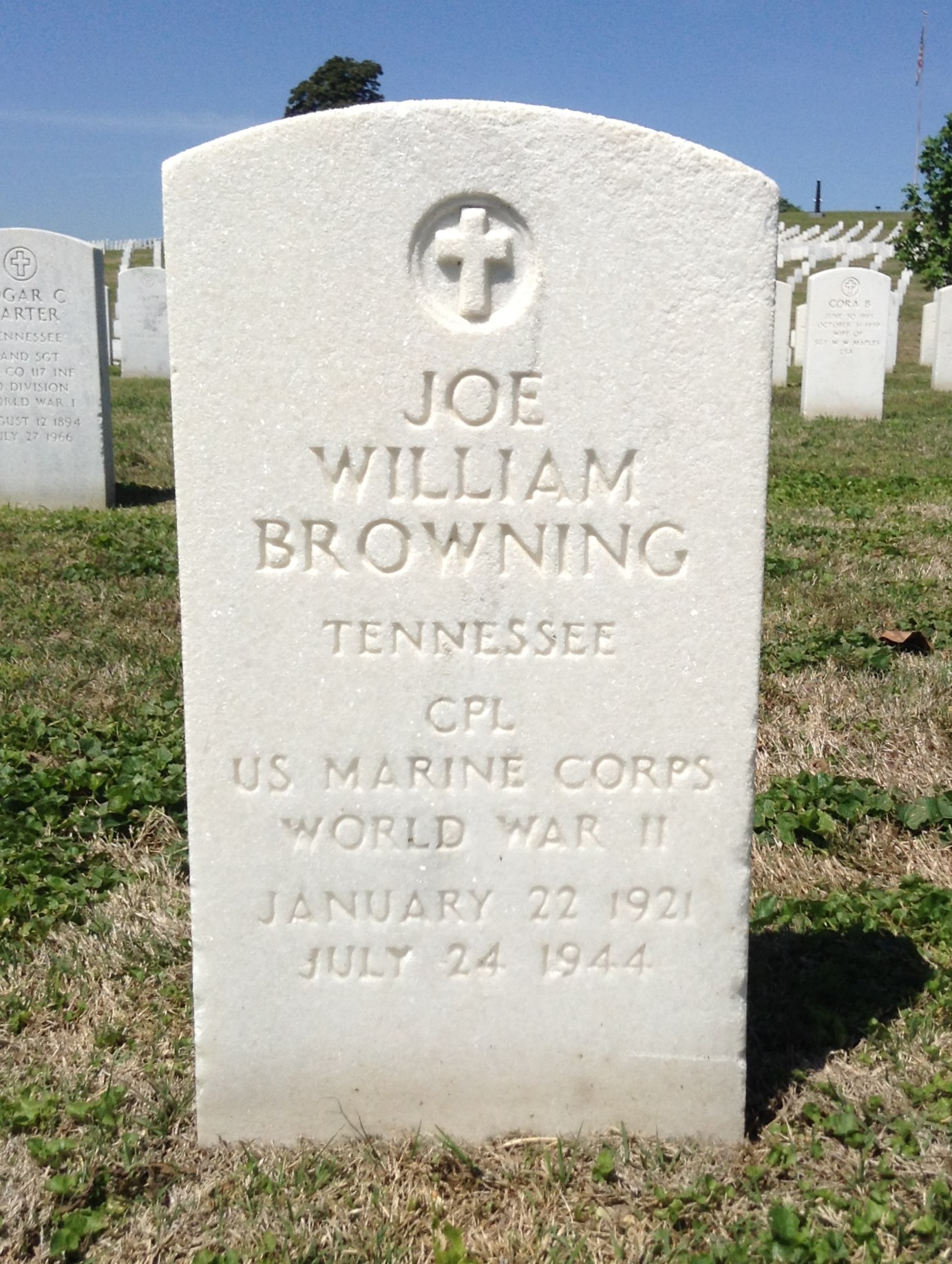 Cpl. Joe W.Browning, USMC, husband of Mrs. J.W. Browning and son of Mr. and Mrs. J.H. Browning, Stadifer Road. Cpl. Browning was killed in action in an undisclosed theater in the South Pacific, Lt.Gen. A.A. Vandegrift, commandant of the U.S. Marine Corps, informed Mrs. Browning in a telegram received August 28. He had served with the marine corps for the past two years, and had been overseas seven months. A former employe of the Miller Supply Company, Cpl. Browning was holder of the Purple Heart Medal for wounds received in the invasion of the Marshall Islands. He was a member of the Morris Hill Baptist Church and the first meber of the church to be reported killed in military action, relatives stated. He is survived by his wife and two children, Cynthia Marie and Joe William Browning Jr.; parents, twin brothers, Frank and Fred Browning, now serving in the European theater.