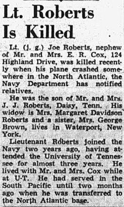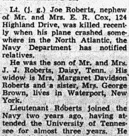 Lt. (jg) Joe William Roberts, navy airman, son of Mr. and Mrs. J.J. Roberts of Daisy, was killed in a plane crash while on duty in the North Atlantic, his wife, Mrs. Margaret Roberts was informed by the Navy Department.