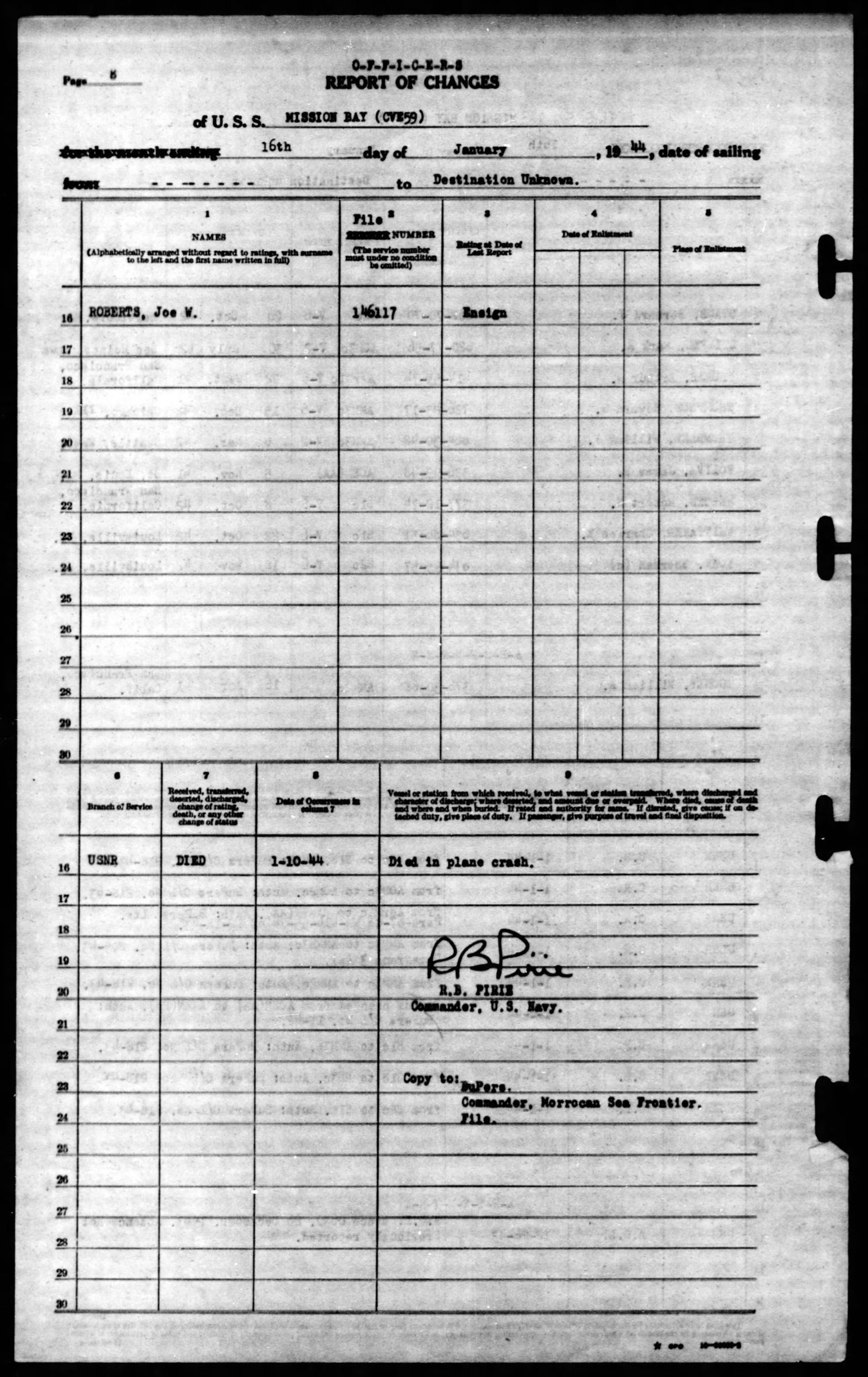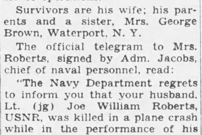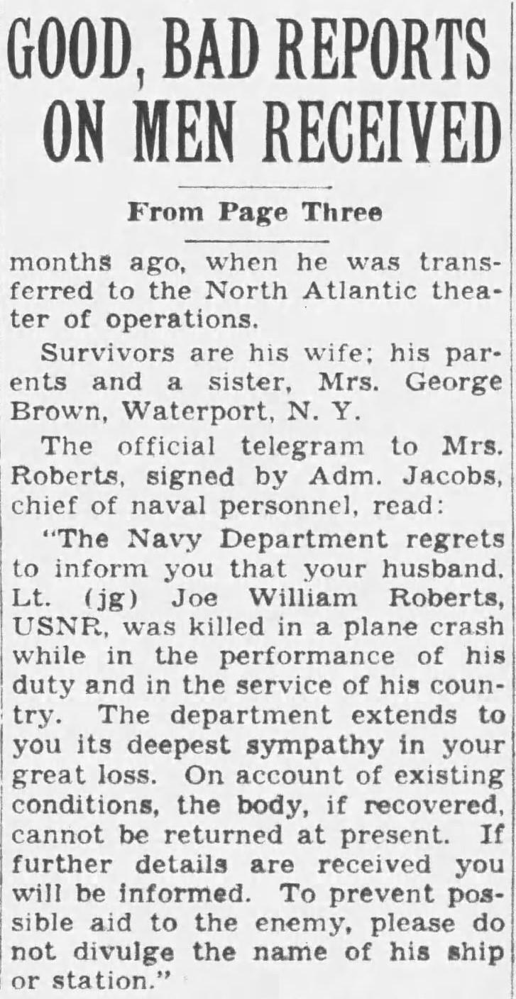The official telegram to Mrs. Roberts, signed by Adm. Jacobs, chief of naval personnel, read: “The Navy Department regrets to inform you that your husban, Lt. (jg) Joe William Roberts, USNR, was killed in a plane crash while in the performance of his duty and in the service of his country. The department extends to you its deepest sympathy in your great loss. On account of existing conditions, the body, if recovered, cannot be returned at present. If further details are received you will be informed. To prevent possible aid to the enemy, please do not divulge the name of his ship or station.